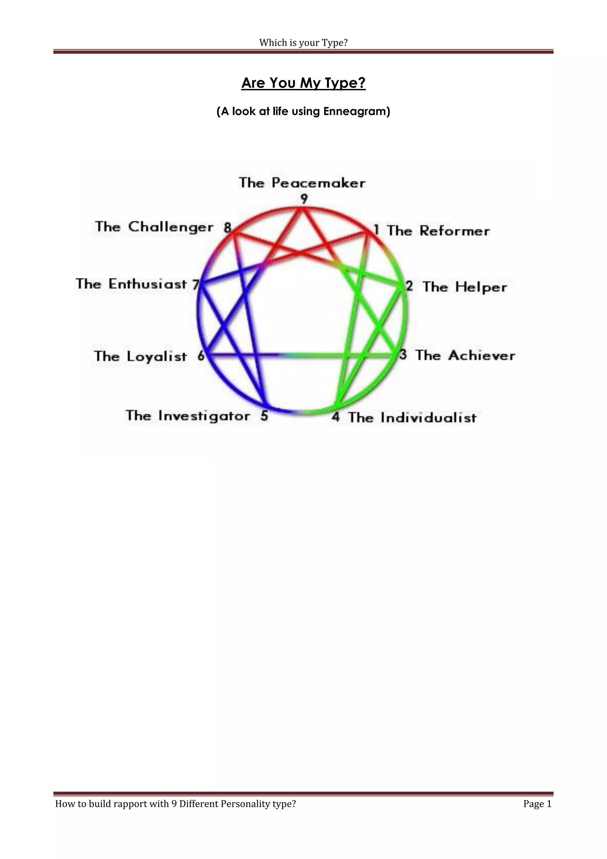 The document describes the nine personality types of the Enneagram system. It provides details about the core traits and motivations of Type One (The Perfectionist), Type Two (The Helper), and Type Three (The Achiever). For each type, it discusses what they typically like and find difficult about their personality, how they often were as children, how they tend to be as parents, and tips for getting along with them.