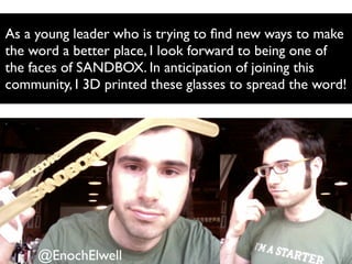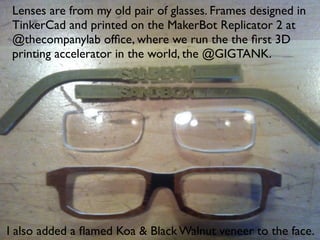 As a young leader looking to make the world a better place, the author 3D printed glasses to promote SANDBOX, a community they are joining. The frames were designed in TinkerCad and printed on a MakerBot Replicator 2 at the company lab, which runs the first 3D printing accelerator. The author added flamed Koa and Black Walnut veneer to the frames. When not making 3D printed items, the author connects creative entrepreneurs through a program called COSTARTERS and asks what others are making.