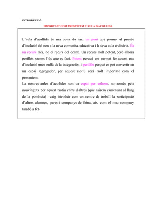 IMPORTANT COM PRESENTEM L’AULA D’ACOLLIDA