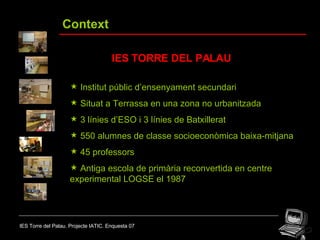 IES Torre delPalau. Projecte IATIC. Enquesta 07 Context Institut públic d’ensenyament secundari Situat a Terrassa en una zona no urbanitzada 3 línies d’ESO i 3 línies de Batxillerat 550 alumnes de classe socioeconòmica baixa-mitjana 45 professors Antiga escola de primària reconvertida en centre experimental LOGSE el 1987 IES TORRE DEL PALAU
