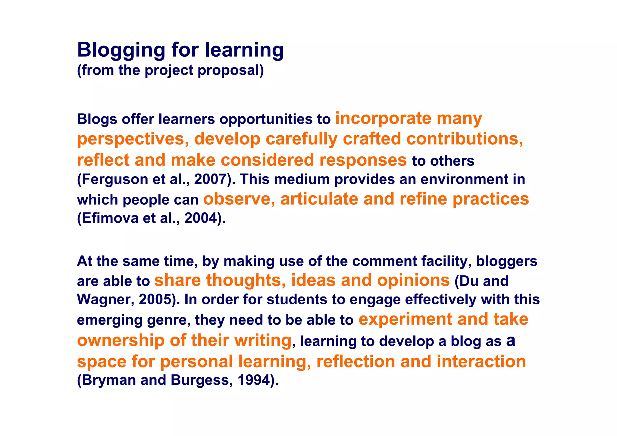 The document describes the EnquiryBlogger project, which uses blog-based learning analytics to support the development of learning power and authentic enquiry. It discusses challenges in current education and the need to develop lifelong learning dispositions. The Effective Lifelong Learning Inventory (ELLI) is presented as a framework for assessing seven dimensions of learning power. The concept of authentic enquiry is introduced as a way to connect learning to personal curiosity, values and passion. The EnquiryBlogger platform and WordPress plugins are described as a way to support blogging, reflection, and the addition of learning analytics visualizations related to ELLI dimensions and the authentic enquiry process. The tools were piloted with primary, secondary and tertiary students