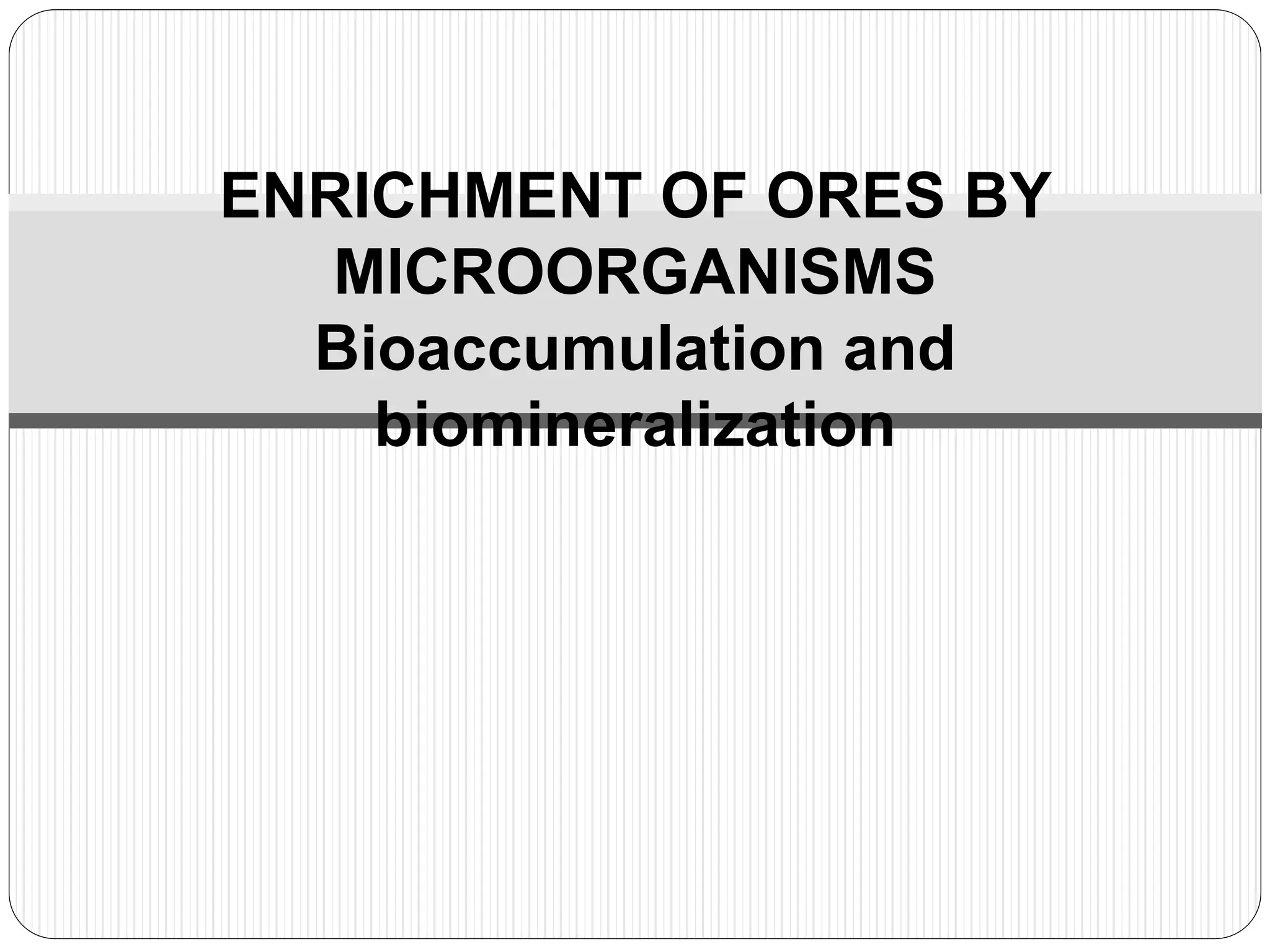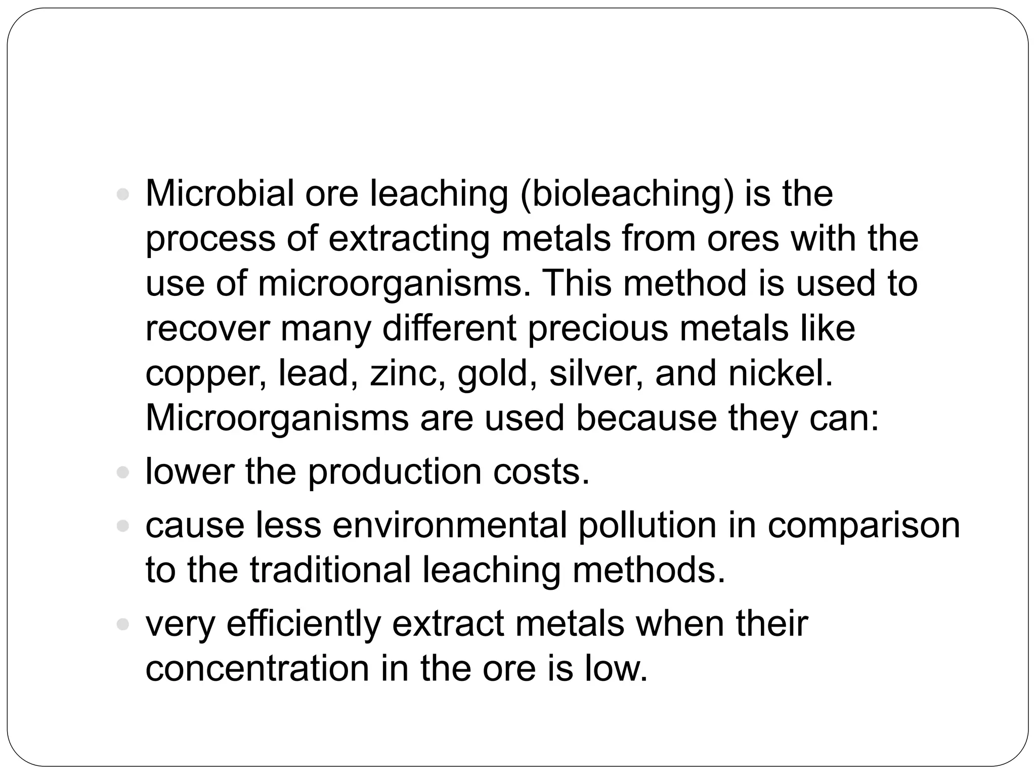 Microbial ore leaching, or bioleaching, utilizes microorganisms to extract metals from ores, offering a cost-effective and environmentally friendly alternative to traditional methods. Key bacteria, such as Acidithiobacillus ferrooxidans, facilitate reactions that lead to metal recovery while reducing pollution, although they may operate more slowly than chemical processes. The document further elaborates on various bioleaching processes, the role of fungi, and the significance of biomineralization and bioaccumulation in environmental contexts.