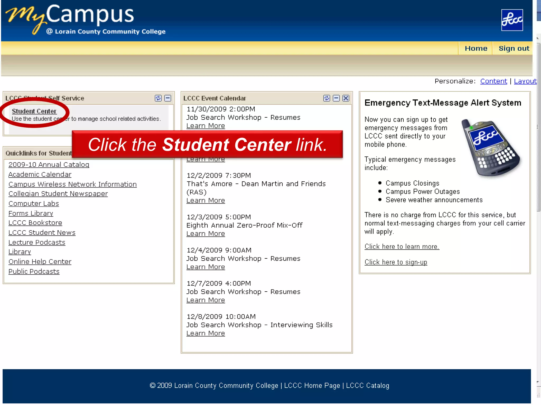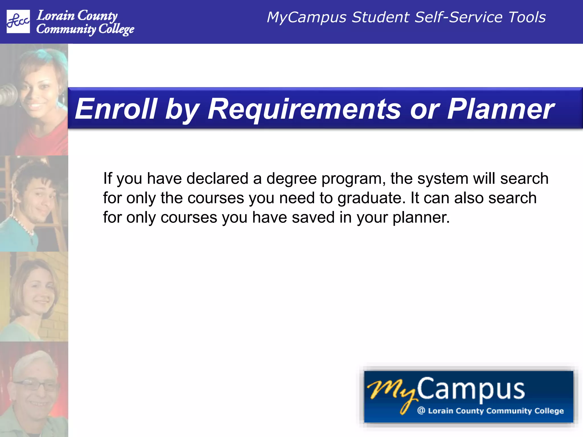 This document provides instructions for students to enroll in courses using the MyCampus Student Self-Service tools. It explains that students can search for courses needed to graduate based on their declared degree program or courses they have saved in their academic planner. It outlines clicking the Student Center link, then Enroll, and selecting either "My Requirements" to see remaining degree requirements or "My Planner" to view saved courses.