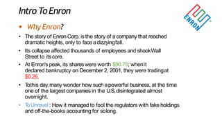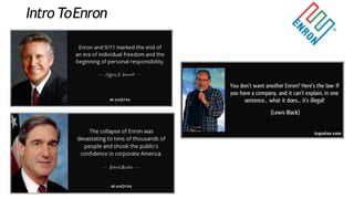 The document outlines the rise and fall of Enron Corp., highlighting its impressive growth due to deregulation and innovative practices, followed by a catastrophic collapse caused by fraudulent accounting and misleading financial reports. Key figures in the scandal include CEO Kenneth Lay, CFO Andrew Fastow, and whistleblower Sherron Watkins, whose actions ultimately led to regulatory reforms like the Sarbanes-Oxley Act of 2002. The aftermath resulted in significant job losses, financial penalties, and a reassessment of corporate governance practices.