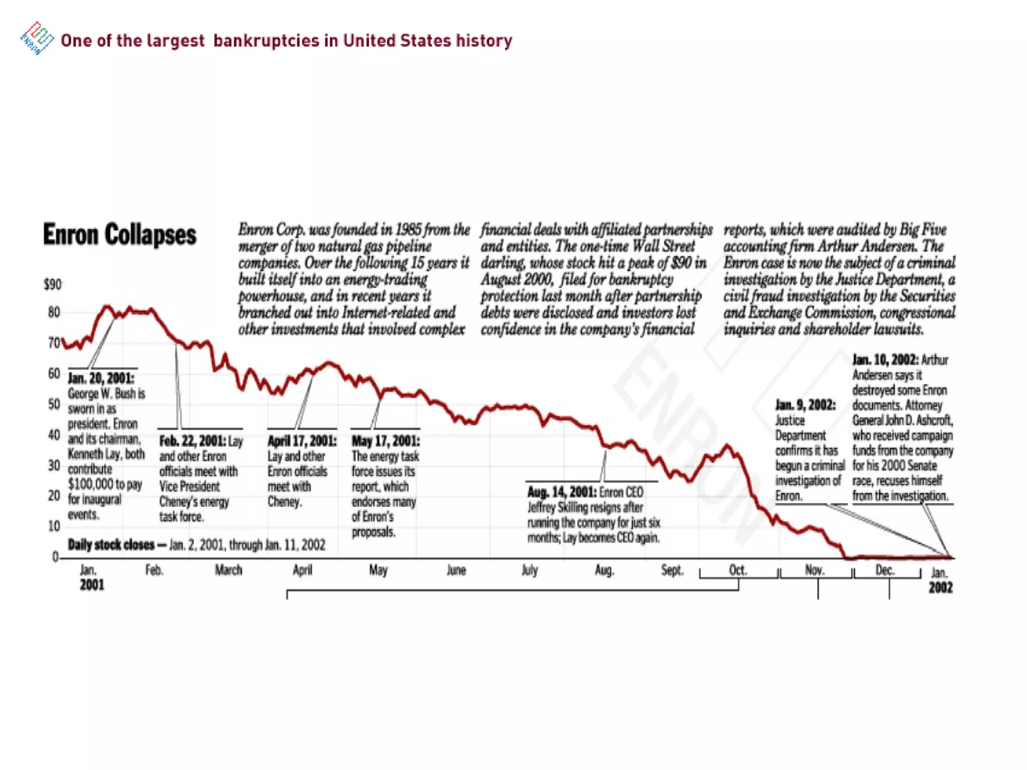 1) Enron began as a natural gas company in 1985 and grew to become an energy and commodities trading company, but collapsed in 2001 due to accounting fraud. 2) The scandal resulted in legislative reforms like the Sarbanes-Oxley Act and saw over $21 billion recovered for creditors through bankruptcy proceedings by 2008. 3) While the collapse of Enron damaged investor trust, recovery efforts saw most creditors receive returns approaching 52 cents on the dollar, exceeding original bankruptcy estimates.