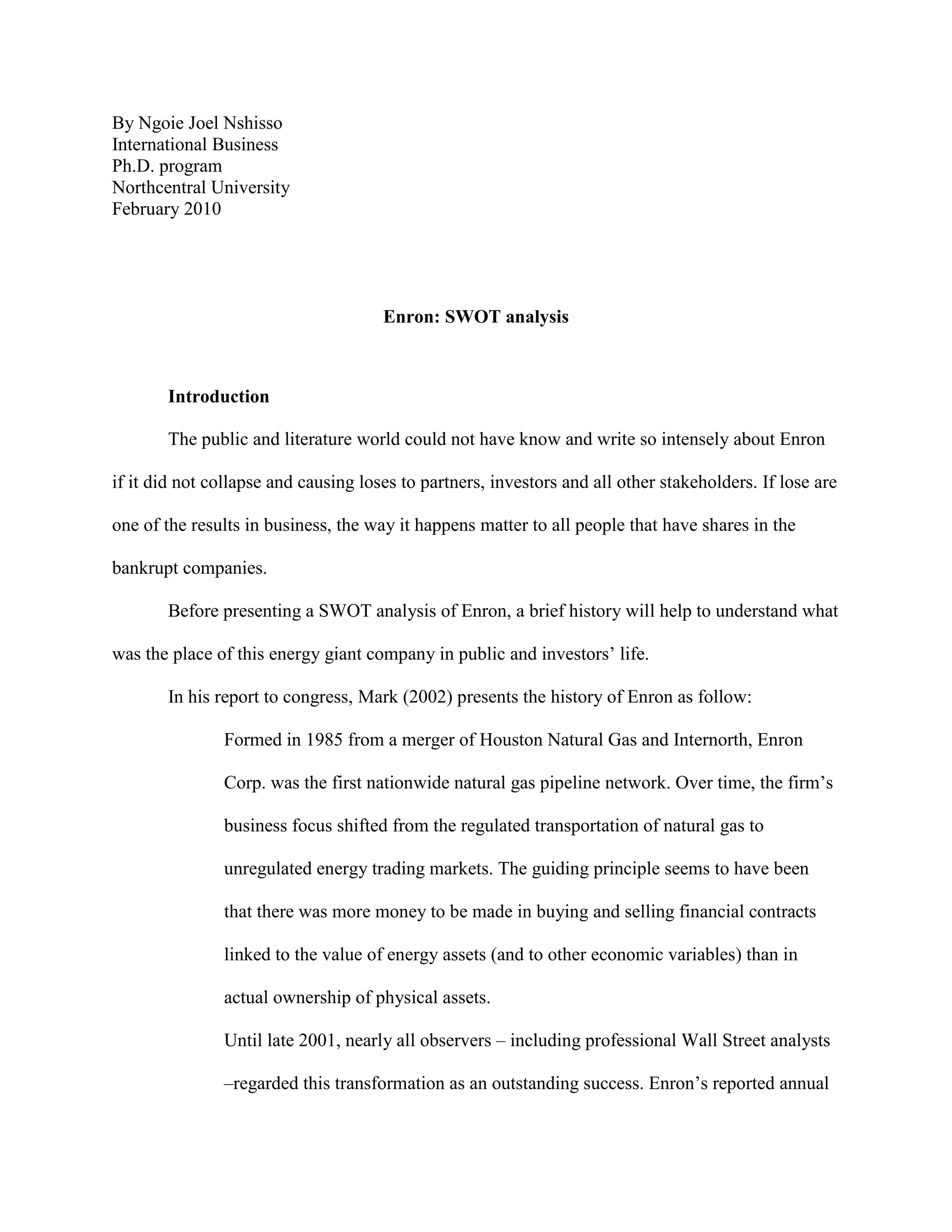 ![By Ngoie Joel Nshisso<br />International Business<br />Ph.D. program<br />Northcentral University<br />February 2010<br />Enron: SWOT analysis<br />Introduction<br />The public and literature world could not have know and write so intensely about Enron if it did not collapse and causing loses to partners, investors and all other stakeholders. If lose are one of the results in business, the way it happens matter to all people that have shares in the bankrupt companies.<br />Before presenting a SWOT analysis of Enron, a brief history will help to understand what was the place of this energy giant company in public and investors’ life.<br />In his report to congress, Mark (2002) presents the history of Enron as follow:<br />Formed in 1985 from a merger of Houston Natural Gas and Internorth, Enron Corp. was the first nationwide natural gas pipeline network. Over time, the firm’s business focus shifted from the regulated transportation of natural gas to unregulated energy trading markets. The guiding principle seems to have been that there was more money to be made in buying and selling financial contracts linked to the value of energy assets (and to other economic variables) than in actual ownership of physical assets.<br />Until late 2001, nearly all observers – including professional Wall Street analysts –regarded this transformation as an outstanding success. Enron’s reported annual revenues grew from under $10 billion in the early 1990s to $101 billion in 2000, ranking it seventh on the Fortune 500.<br />The unraveling began in August 2001, when CEO Jeffrey Skilling resigned for undisclosed reasons. On October 16, Enron reported its first quarterly loss in 4 years, CRS-2 taking a charge against earnings of $1 billion for poorly performing businesses. The reported third quarter loss was $618 million, versus a $292 million profit a year earlier.<br />On November 8, the company announced in a Securities and Exchange Commission (SEC) filing that it was restating its earnings since 1997 – reducing them by $586 million. The coup-de-grace came on November 28, when the major bond rating agencies downgraded Enron’s debt to below-investment-grade, or junk bond status. The company filed for Chapter 11 bankruptcy on December 2, 2001. (pp. 1-2)<br />Bankruptcy is a combination of internal and external factors that did play against the company and prevented it to stay in business. The scanning of those factors is made in a mechanism called SWOT analysis. In the sections below, this mechanism will applied to Enron to try to understand how a marriage between them was the occasion to push the company out of business.<br />SWOT Analysis<br />The SWOT analysis describes the internal strengths and weaknesses, opportunities and threats of a company. Ferrell, Hartline, and Luc. (2006) define SWOT analysis as: <br />Basic, straightforward model that provides direction and serves as a basis for the development of marketing plans. It accomplishes this by assessing an organizations strengths (what an organization can do) and weaknesses (what an organization cannot do) in addition to opportunities (potential favorable conditions for an organization) and threats (potential unfavorable conditions for an organization). SWOT analysis is an important step in planning and its value is often underestimated despite the simplicity in creation. The role of SWOT analysis is to take the information from the environmental analysis and separate it into internal issues (strengths and weaknesses) and external issues (opportunities and threats). Once this is completed, SWOT analysis determines if the information indicates something that will assist the firm in accomplishing its objectives (a strength or opportunity), or if it indicates an obstacle that must be overcome or minimized to achieve desired results (weakness or threat).<br />A close study of Enron shows that the company could be credited with the following SWOT facts:<br />Strengths<br />Marketing and value delivery<br />Enron did not become overnight an energy giant serving multitude of customers. Its success is a result of marketing and value delivery. Marketing helped Enron to identify and meet customer needs. As it is recognized by Kotler and Lane (2006), “Marketing involves satisfying consumers’ needs and wants. The task of any business is to deliver customer value at a profit. In a hypercompetitive economy with increasingly rational buyers faced with abundant choices, a company can win only by fine-tuning the value delivery process and choosing, providing and communicating superior value.” (p. 36)Human capital pool<br />Cynthia, Lyle, and James (2006) assert that “to gain competitive advantage, Human Resource managers must (a) help the organization develop human pool that has higher overall level of skills, abilities, and knowledge than competitors; and (b) ensure that the skills, abilities, and knowledge within the human capital pool are more closely aligned with the strategic objectives of the firm than is typical among competitors.” (p. 53)<br />Most companies engage in one or two lines of businesses. Enron was running after almost five different line of business: pipeline network, energy trading market, electricity and natural gas, pulp and paper and communications. All of them with different requirements on skills, equipments, and reporting methods. Enron succeeded to recruit and maintain employees from various educations an experience background. All point to believe that human capital pool was well organized and energized to accomplish the work without friction. <br />Competitive advantage on jet fuel sale after terrorist attack of September 11, 2001<br />One of the consequences of the terrorist attack on September 11, 2001 was economy disruption of the airline business. Any company that could offer securely commodity in this business gained competitive advantage. Sanders (2001) of market watch reported that:In the wake of the Sept.