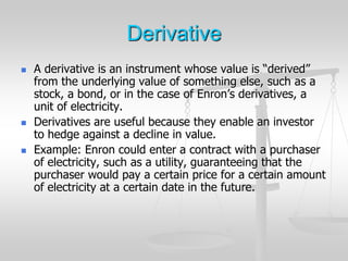 Enron collapsed due to fraudulent accounting practices that hid massive losses and inflated profits. When these practices were uncovered, Enron filed for bankruptcy in 2001. The scandal highlighted the need for reforms to ensure transparency and prevent conflicts of interest between companies and their auditors. It shook public trust in corporations and led to new regulations like the Sarbanes-Oxley Act and the creation of the Public Company Accounting Oversight Board.