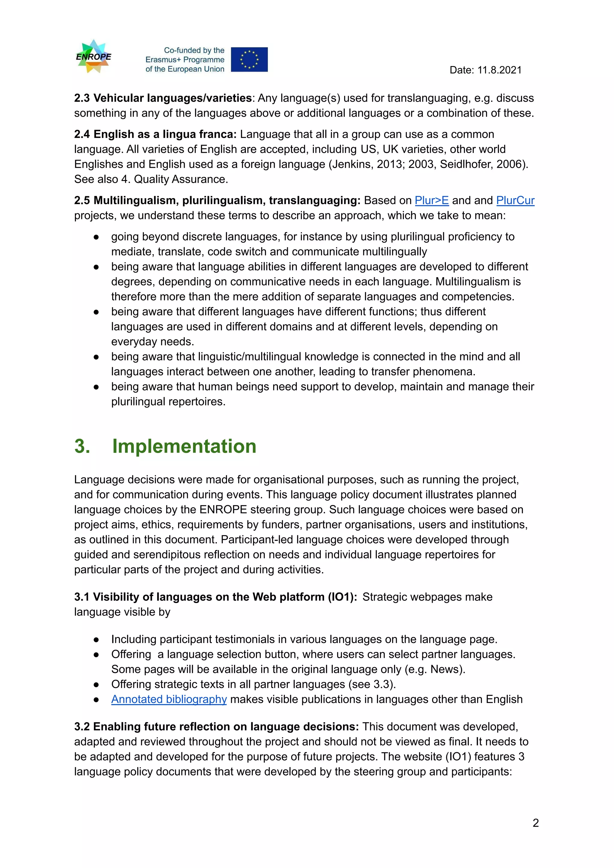 This document outlines the language policy of the ENROPE Group, which aims to promote multilingualism and inclusion. The policy defines key terms, discusses implementation strategies like translating essential materials into partner languages, and establishes a quality assurance process. Partner languages will be visible on the website, and strategic texts, the competency model, handbook introduction, and other materials will be translated. Documents will undergo multi-step reviews by colleagues from different institutions to ensure clarity and soundness for a diverse audience.