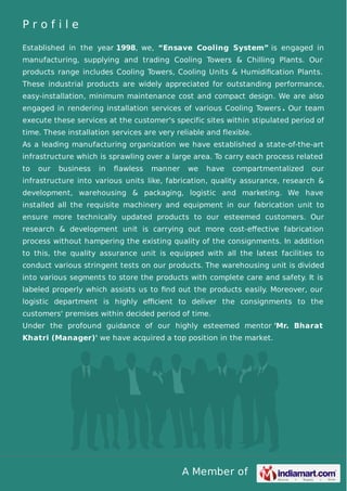 Ensave Cooling System, established in 1998, is a reputable manufacturer and supplier of cooling towers, chilling plants, and cooling units, offering installation services as well. The company is recognized for its high-quality, low-maintenance products and a robust infrastructure that supports efficient fabrication and logistics. Led by Mr. Bharat Khatri, Ensave maintains a strong market position by emphasizing research and development for cost-effective solutions.