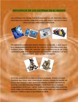 Systems now play a fundamental role in our lives and have allowed humanity to accomplish things that were previously unimaginable, such as communicating with people around the world. Technological advances will likely continue as ideas and solutions are developed to improve quality of life, healthcare, and overcome physical limitations. The progress of science seems endless as it brings more comfort and easier ways of living every day.
