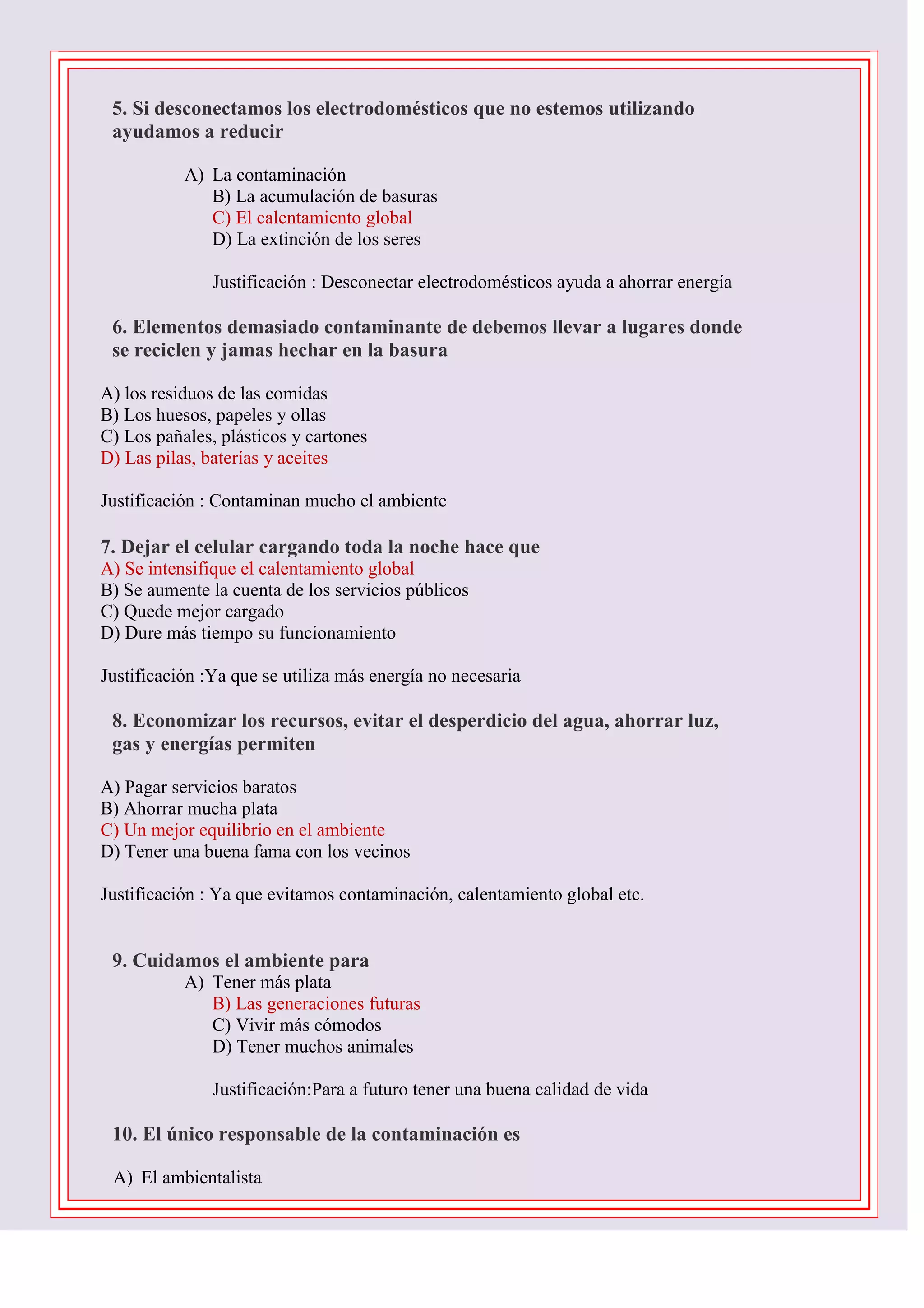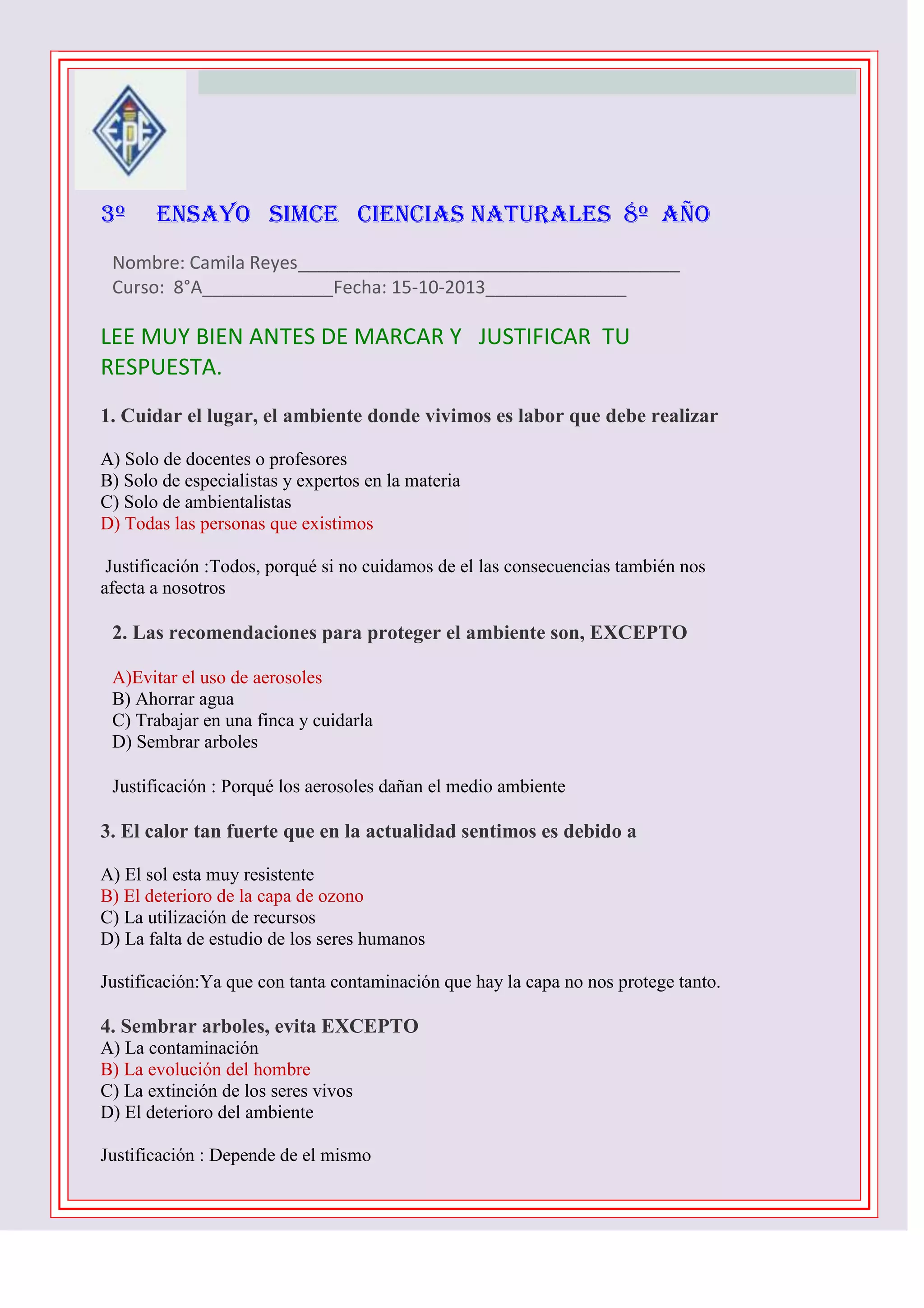 Este documento presenta un examen de ciencias naturales de 8o grado que contiene 10 preguntas sobre el cuidado del medio ambiente. Cada pregunta ofrece 4 opciones de respuesta y pide al estudiante justificar su elección. Las preguntas cubren temas como la responsabilidad de cuidar el medio ambiente, formas de reducir la contaminación como desconectar electrodomésticos y reciclar pilas, y los beneficios de proteger el ambiente para las generaciones futuras.