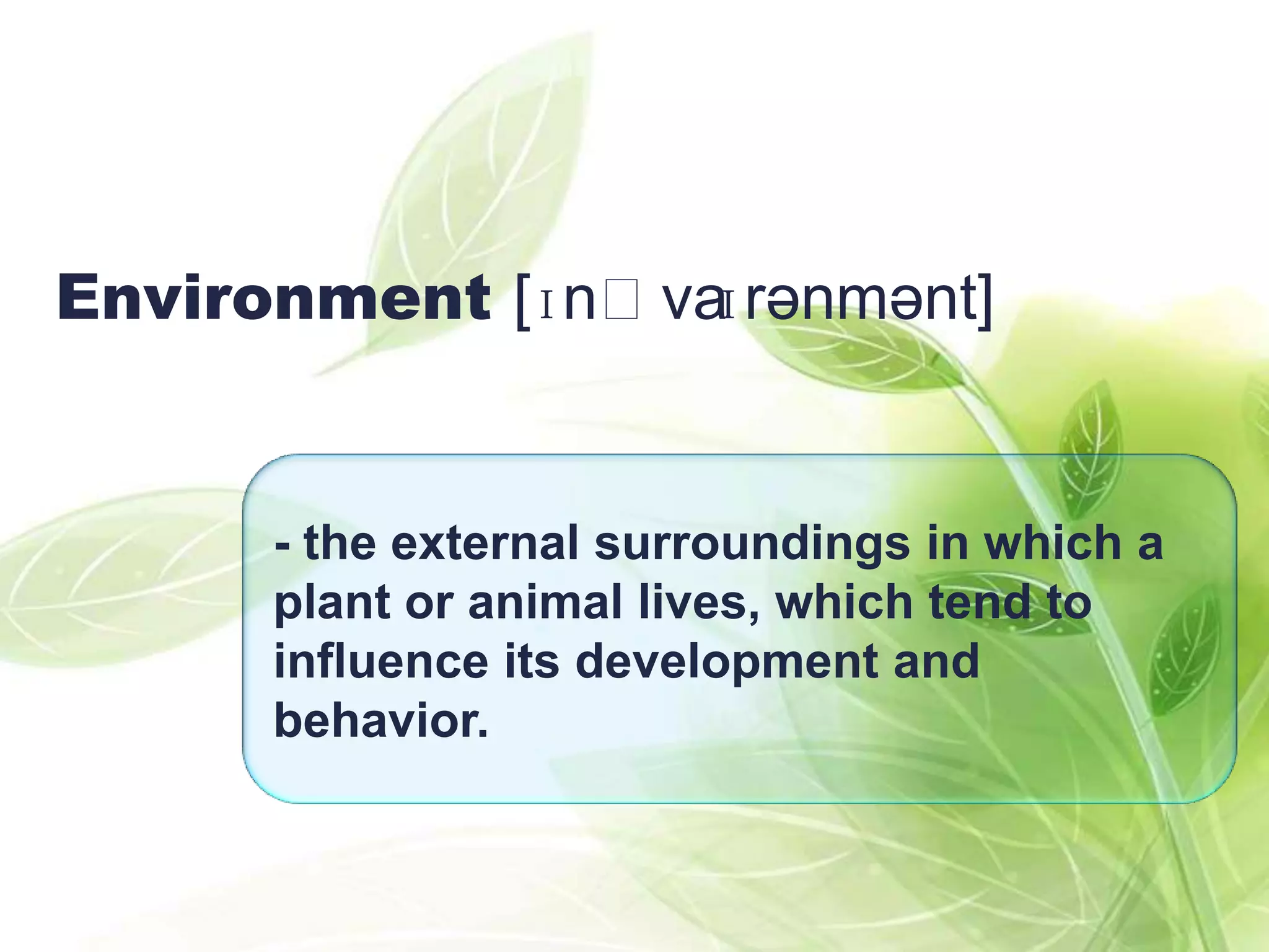 1. It defines environment, ecology, and ecosystem - describing the interactions between organisms and their physical surroundings.