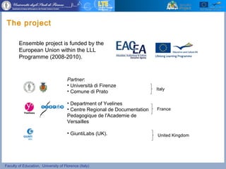 The document summarizes a project that used podcasts and multimedia messages (MMS) to provide learning opportunities for immigrant citizens in Italy and France. The project aimed to promote cultural and social integration using widely available technologies like mobile phones, MP3 players, and netbooks. Podcasts containing micro-lessons were created for students on topics like European citizenship, while parents received MMS messages. The goals were to design easy to use and familiar formats based on principles of cognitive learning theory. An experiment involved students and parents from China and North Africa in Italy and France.
