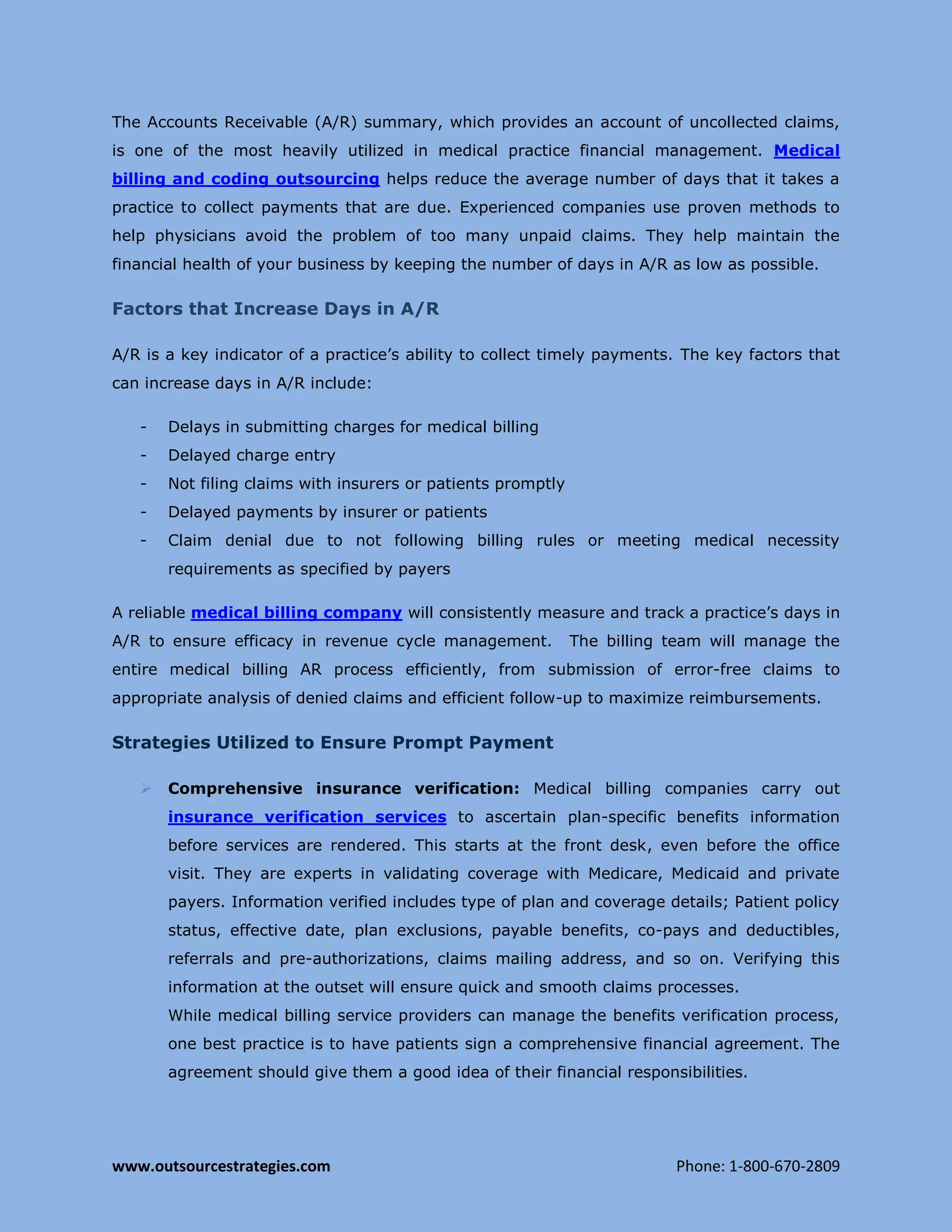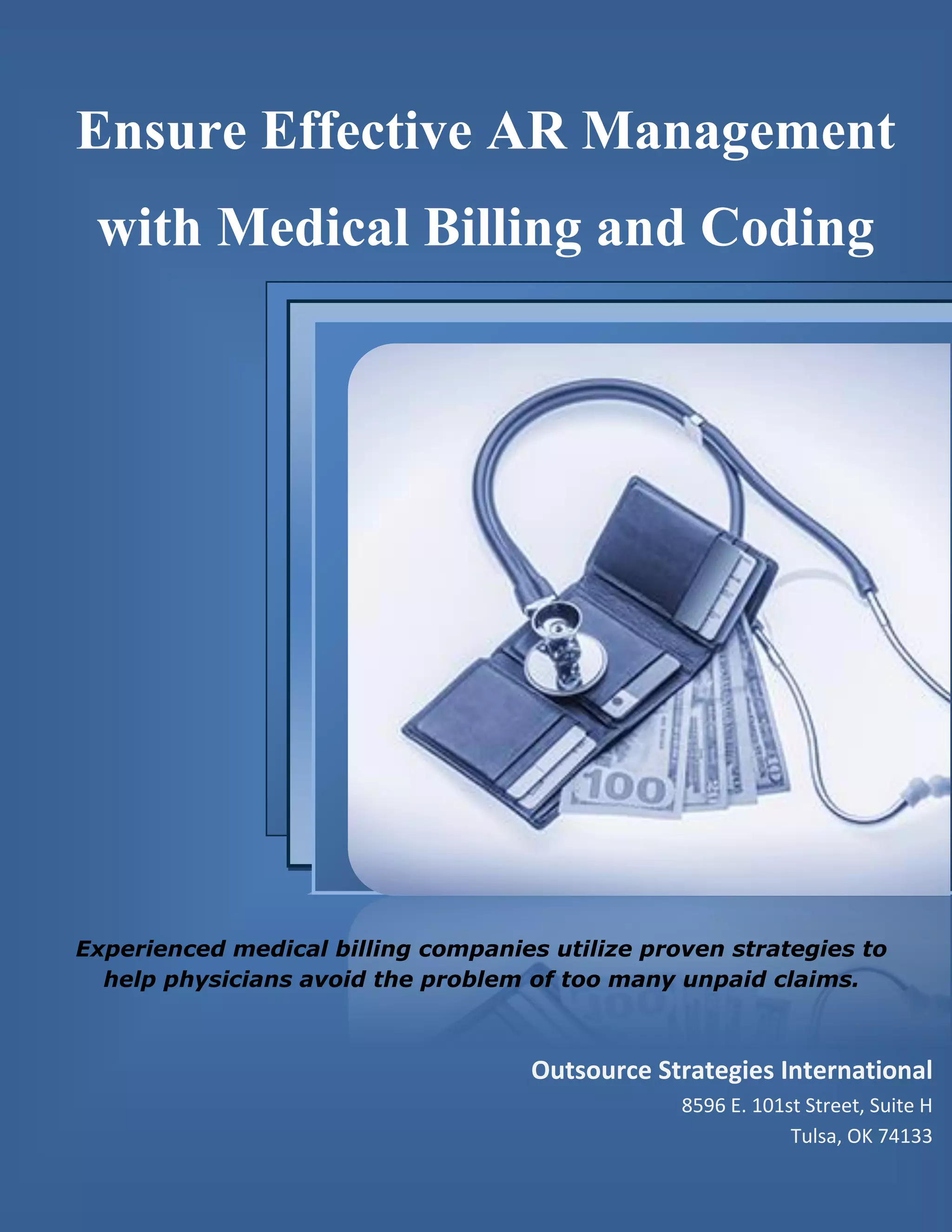 Outsource Strategies International provides medical billing and coding services aimed at reducing accounts receivable (A/R) days for healthcare practices. They utilize methods such as insurance verification, accurate charge entry, and efficient claim submission to ensure timely payments and to address issues like claim denials. The company also offers free A/R analysis to identify and implement strategies for improving collections of unpaid claims.