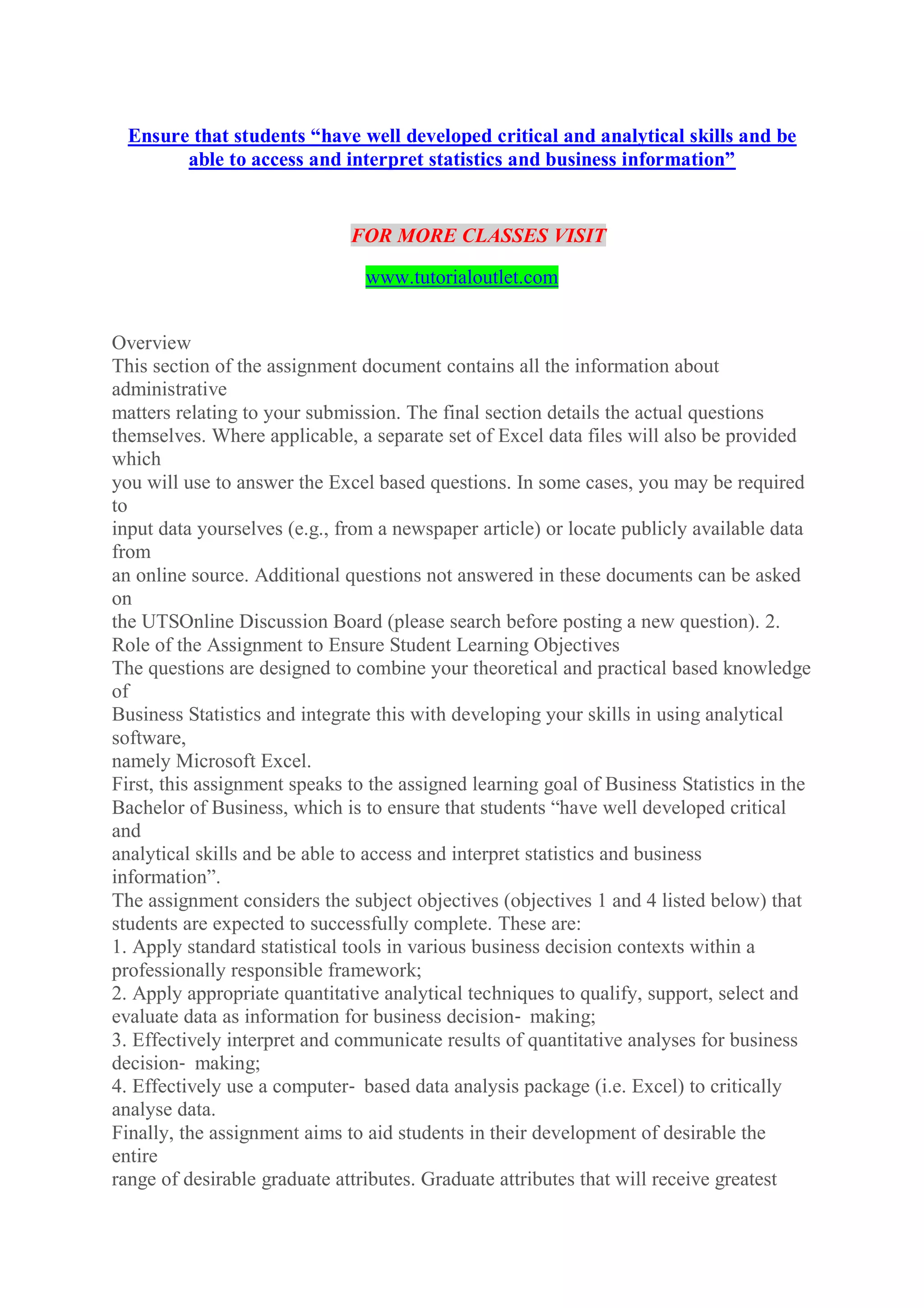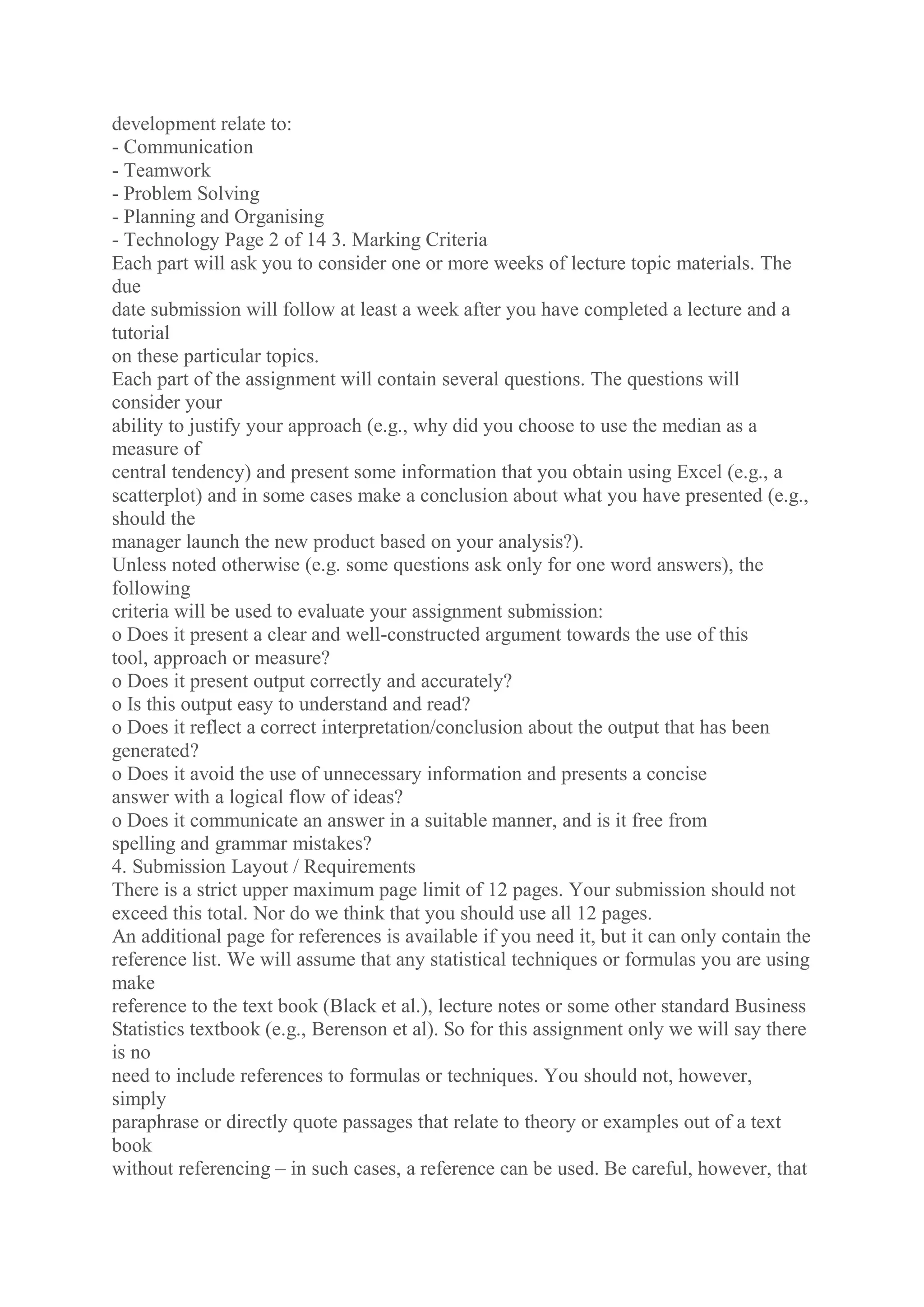 The document outlines the guidelines and expectations for an assignment in a business statistics course, emphasizing the development of critical skills in statistics and data interpretation. It details submission requirements, marking criteria, group work expectations, and consequences for plagiarism, along with providing resources for support. Additionally, it stresses the importance of meeting deadlines and the collaborative effort required from all group members.