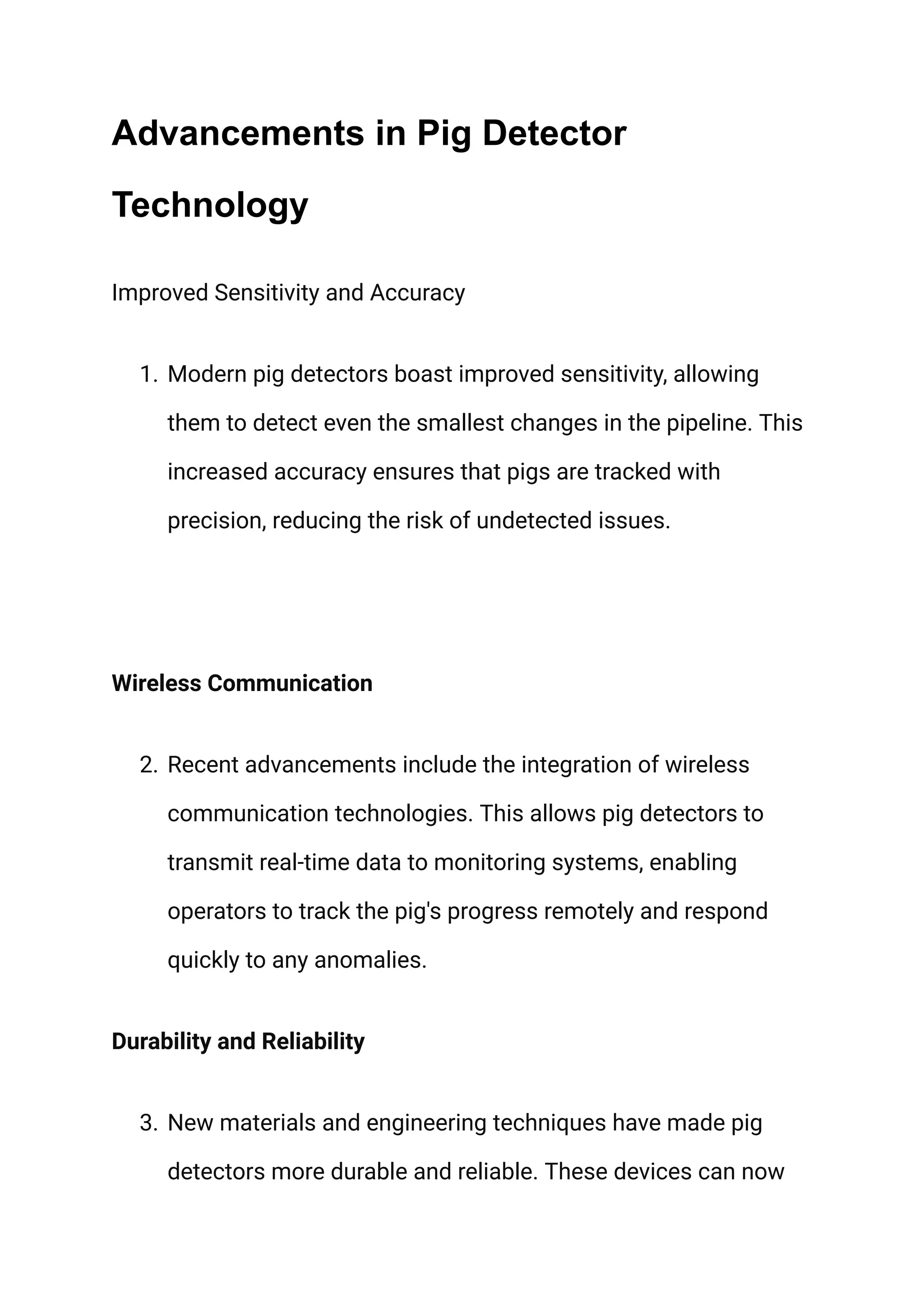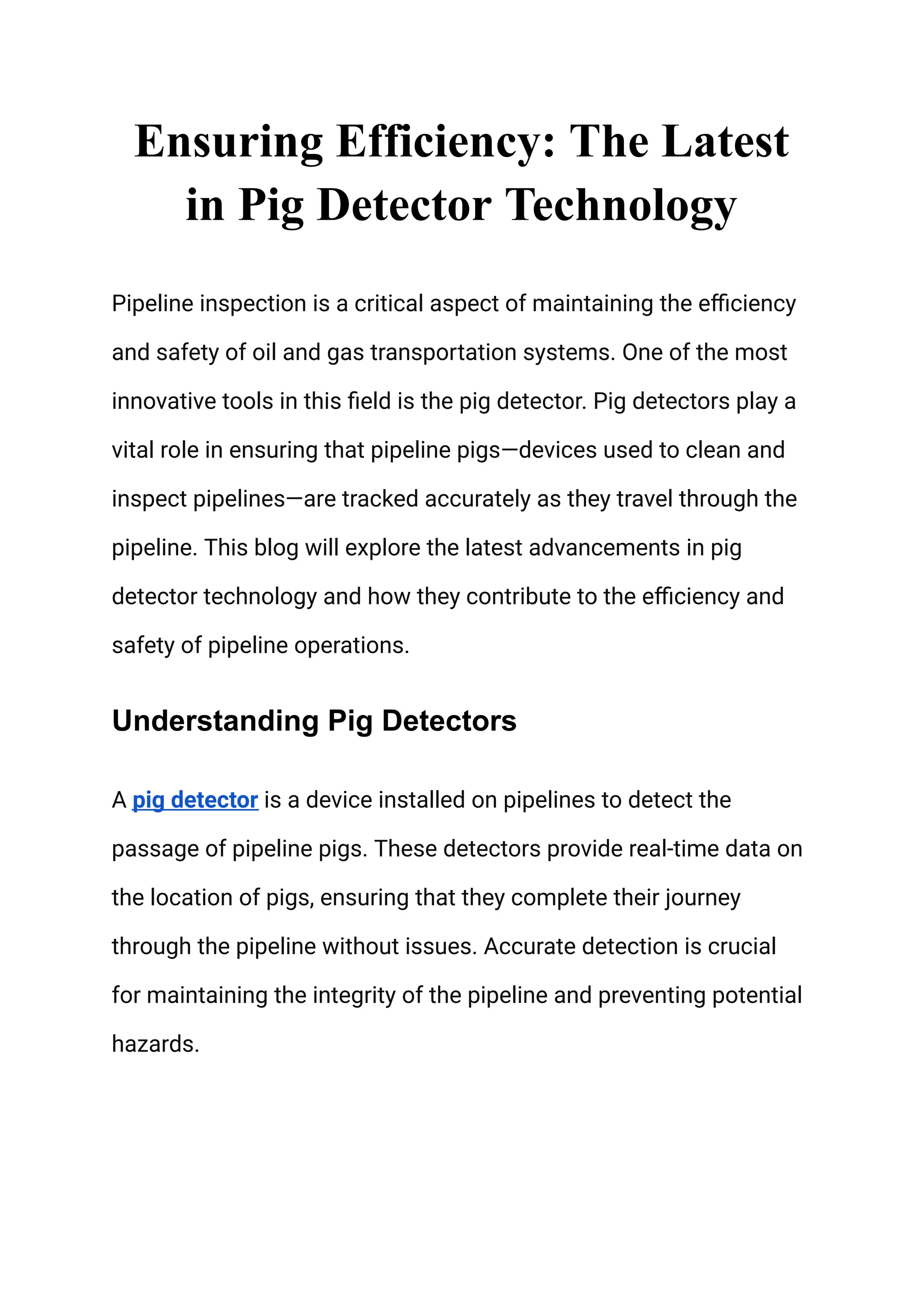 The document discusses advancements in pig detector technology used for tracking devices that clean and inspect pipelines in oil and gas transportation systems. Key improvements include enhanced sensitivity, wireless communication, durability, and advanced data analytics, which collectively increase pipeline safety, operational efficiency, and regulatory compliance. Investing in these modern detectors can lead to significant cost savings and extended pipeline longevity.