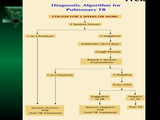 This document outlines guidelines for identifying and diagnosing tuberculosis patients. It describes that undiagnosed pulmonary tuberculosis cases are the main source of infection in communities. The key diagnostic tools discussed are sputum microscopy, x-rays, tuberculin tests, and mycobacterium tuberculosis culture. It provides details on the process of diagnosing tuberculosis using sputum examination at designated microscopy centers, including collecting two sputum samples from patients over two days.