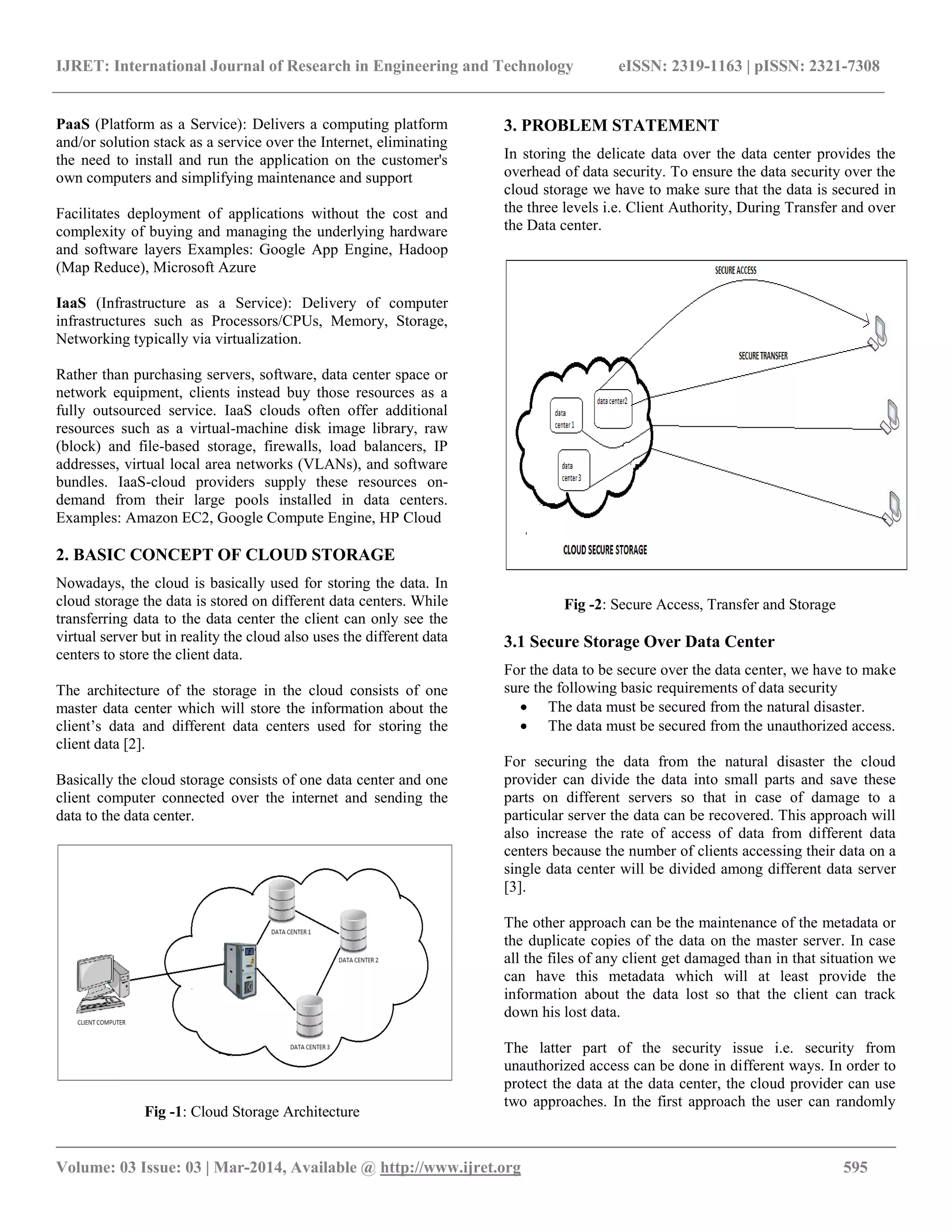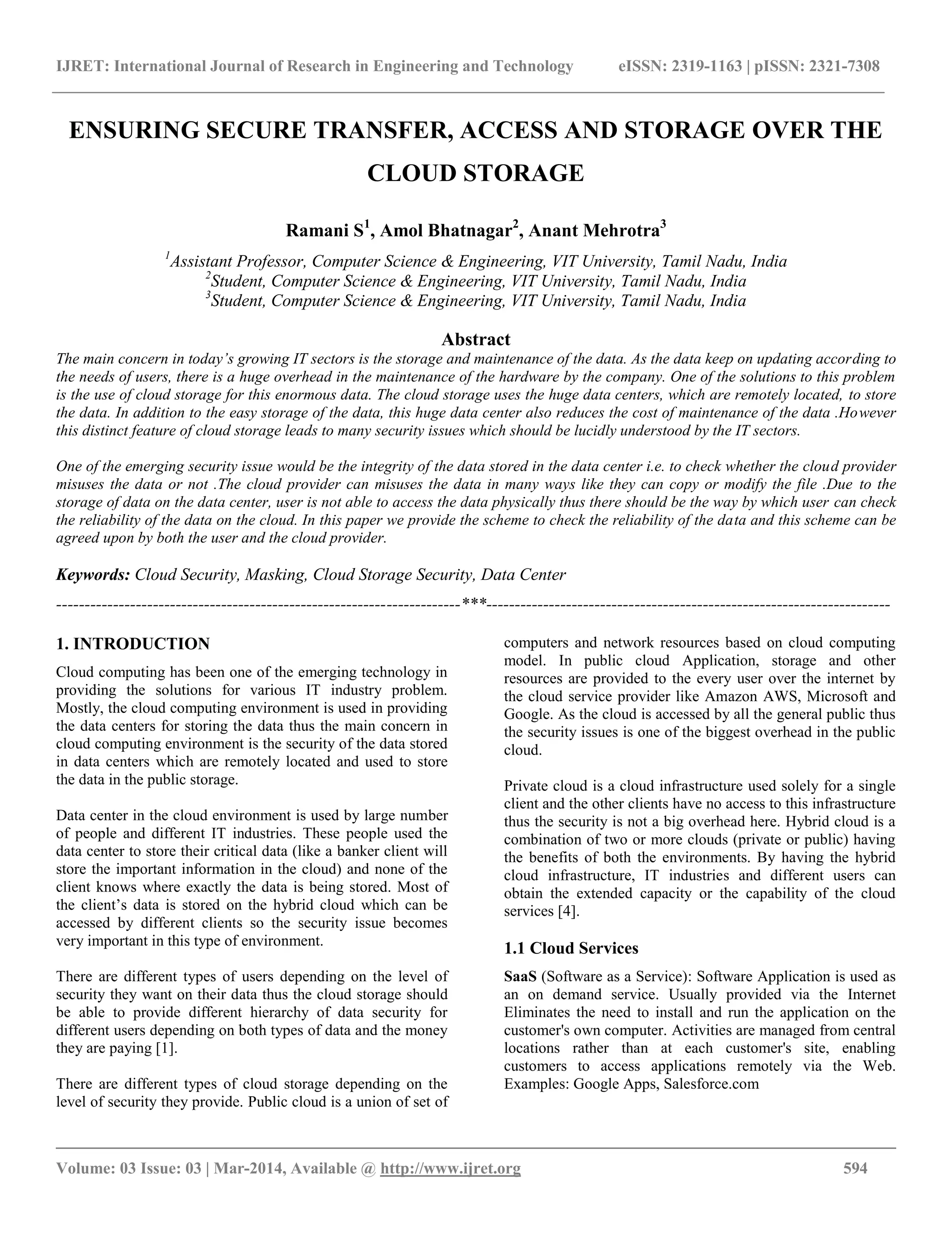 The document discusses the importance of cloud storage for data management and the security challenges associated with it. It highlights the necessity for secure access, transfer, and storage methods to protect sensitive data against unauthorized access and integrity breaches. The authors propose various strategies for maintaining data security within cloud environments, including user authentication and data masking techniques.