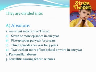 The document outlines the indications for tonsillectomy and divides them into three categories: absolute, relative, and as part of another operation. Absolute indications include recurrent throat infections, peritonsillar abscesses, tonsillitis causing febrile seizures, and tonsil hypertrophy causing airway obstruction or difficulty swallowing. Relative indications include being a carrier of diphtheria or streptococcus. Tonsillectomy may also be performed as part of another operation like palatopharyngoplasty for sleep apnea or glossopharyngeal neurectomy.