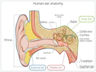 The document summarizes the anatomy and examination of the ear. It describes the external, middle, and inner ear structures. Examination techniques are outlined including otoscopy, tuning fork tests, whisper test, and audiometry. Additional tests mentioned are tympanometry, BERA, VNG, and rotary chair testing to evaluate hearing and balance functions of the ear.