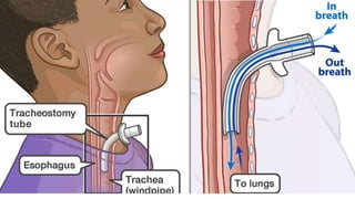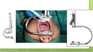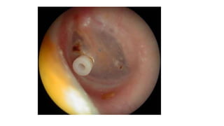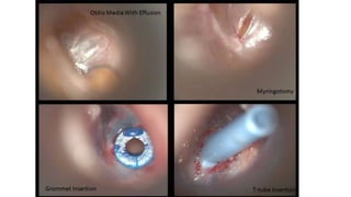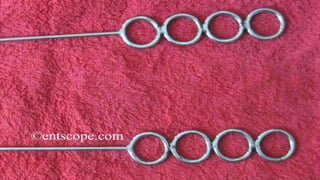 This document provides an overview of various instruments and implants used in ear, nose, and throat (ENT) examinations and surgeries. It includes images and descriptions of common ENT tools such as nasal speculums, laryngoscopes, suction nozzles, ear speculums, tracheostomy tubes, and more. The document serves as a reference for the various medical devices involved in ENT procedures.