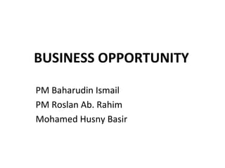 The document discusses identifying business opportunities through recognizing changes in the environment, needs/wants, and problems. It outlines that opportunities emerge when people have needs/wants that are unfulfilled or problems that exist. The entrepreneur then creates a business to meet those needs/solve problems. It provides examples of how changes like technology, society, economics can create opportunities and discusses processes for identifying opportunities through observation, networks and evaluating viability.
