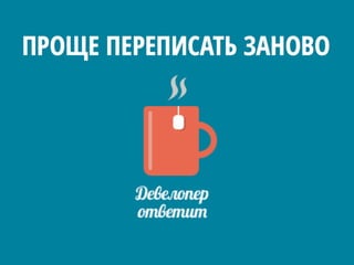 Документ обсуждает проблемы наследия кода и предлагает стратегию рефакторинга с использованием Composer и стандарта PSR-4 для улучшения качества кода. Приводятся примеры ошибок, собранных из логов, и предлагается метод для их анализа, а также рекомендации по использованию инструментов отладки и профилирования. В конце автор предлагает эволюционировать проект, придерживаясь принципов разработки и рассматривает подходы к рефакторингу и тестированию.