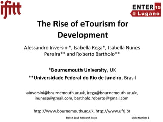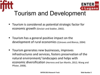 The document discusses the role of eTourism in promoting socio-economic development, particularly in developing countries, and highlights the positive and negative impacts of tourism on local communities and environments. It advocates for community-based tourism as a sustainable and inclusive approach that leverages digital technologies to enhance visibility and economic opportunities for small and medium enterprises. Additionally, it emphasizes the necessity of adopting information and communication technologies for the advancement of tourism and overall development.