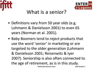 This document presents a qualitative study on senior travelers' use of online travel services, highlighting the characteristics of this demographic and their unique needs during the travel information search process. The research emphasizes the importance of understanding how seniors interact with online platforms and the attributes they value in these services, particularly clarity and ease of use. It concludes that seniors are a heterogeneous group that often does not identify with 'senior' branding in marketing, and they prefer familiar brands while engaging in travel planning.