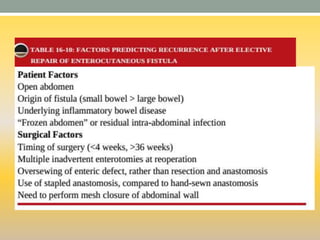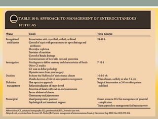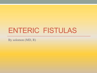The document discusses enteric fistulas, defining them as abnormal connections between epithelial surfaces that may occur post-surgery or due to diseases like cancer or inflammatory bowel disease. It categorizes fistulas based on etiology, anatomy, and drainage output, emphasizing the need for a multidisciplinary approach for effective management, especially for enterocutaneous varieties, which have a high mortality rate. Lastly, the document details the factors contributing to their formation and management strategies, aiming to optimize patient outcomes and prevent complications.