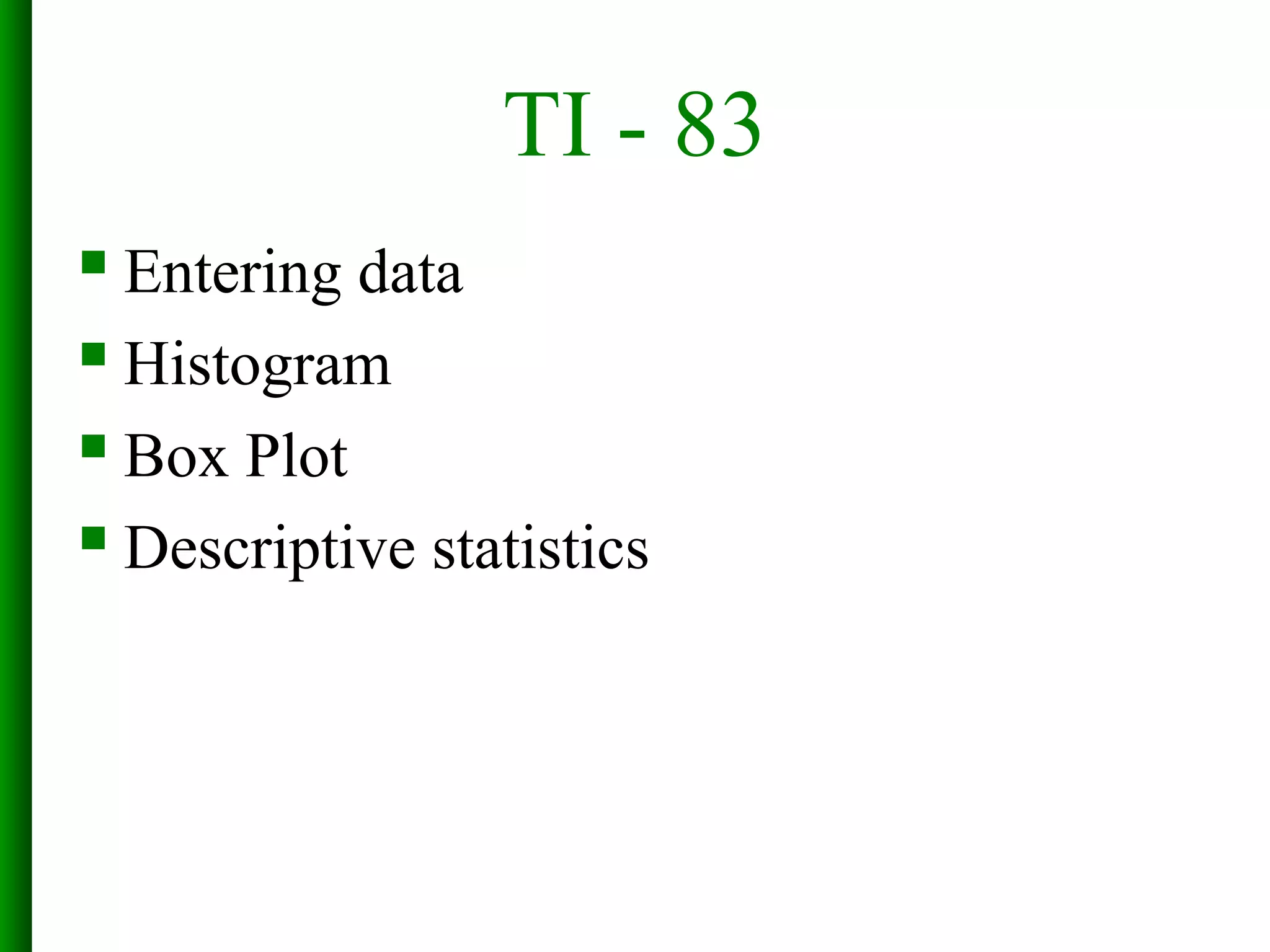 The document discusses statistical analysis features of the TI-83 calculator including entering data, creating a histogram and box plot to visualize data distributions, and generating descriptive statistics.