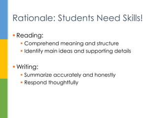 The document summarizes Lorraine Genetti's presentation about using an "Article of the Week" approach to teaching writing skills. She discusses having students read, comprehend, and summarize complex articles. They then respond thoughtfully by integrating quotations and building background knowledge. Genetti provides templates and models to help students learn skills like summarizing accurately, weighing evidence, and participating in academic discussions. The goal is for students to enter meaningful conversations and succeed in college by mastering skills like argumentation.