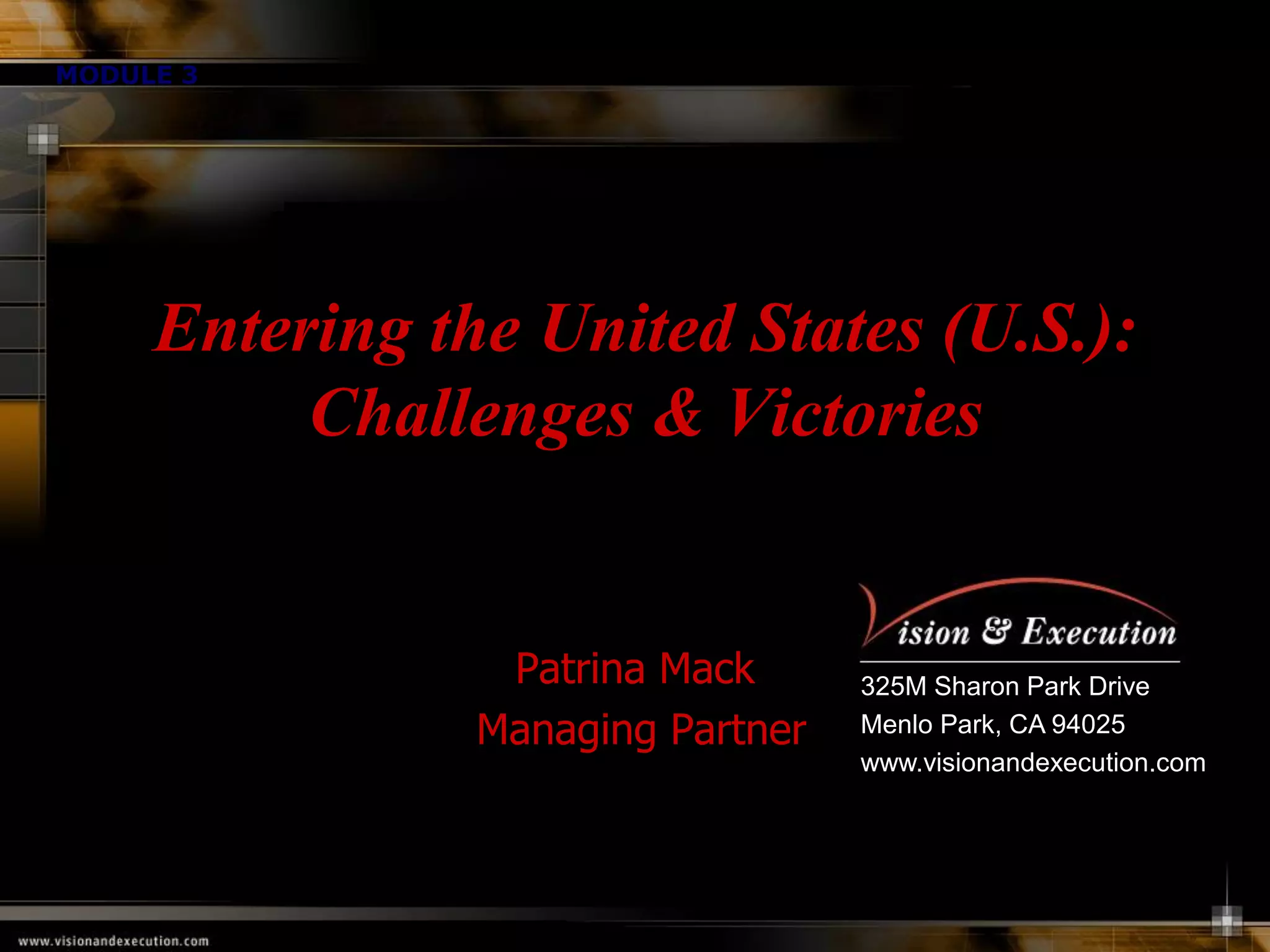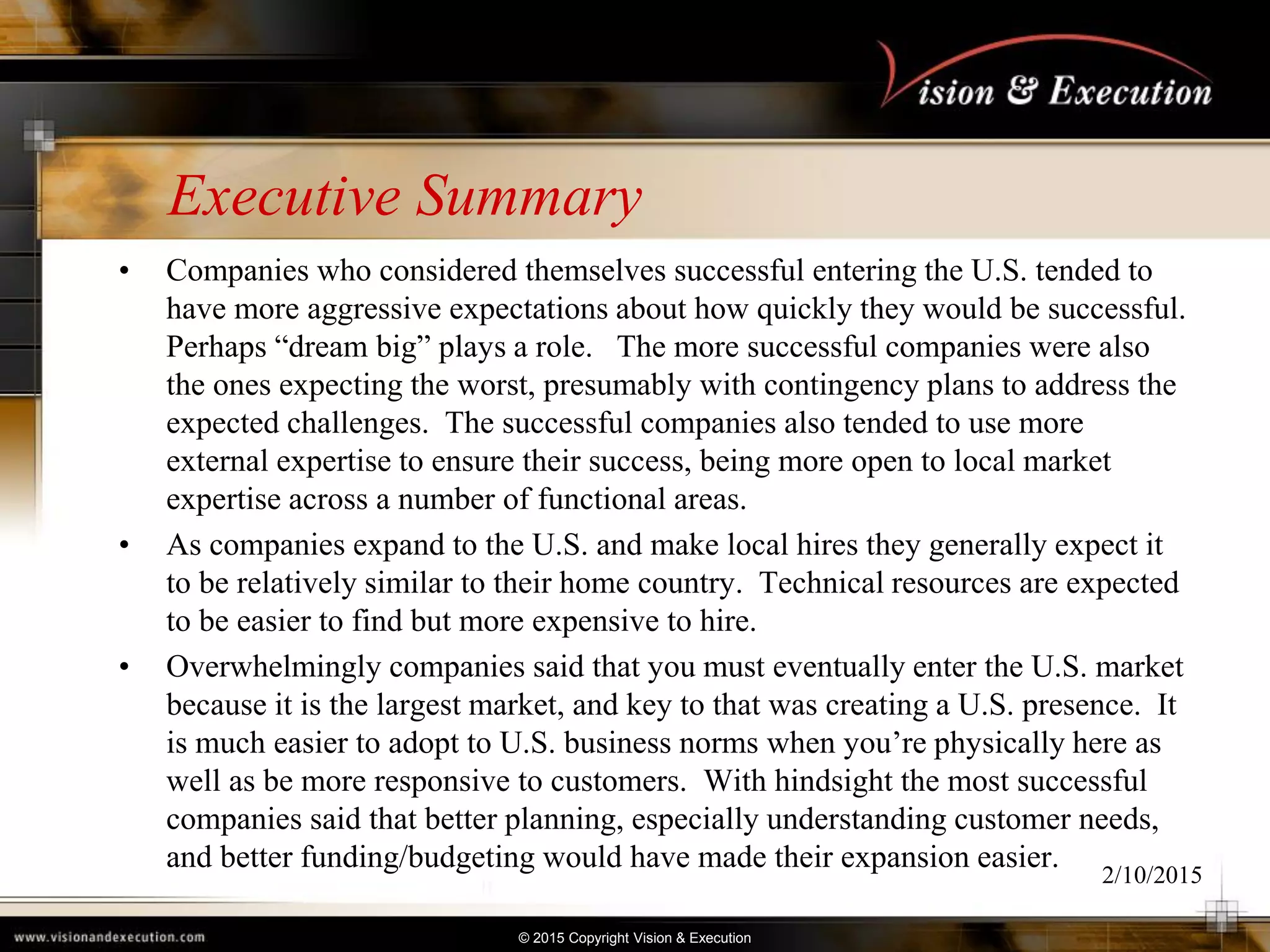The document summarizes the results of a survey of 68 international companies regarding their experiences and challenges entering the US market. Key findings include: companies who were most successful had more aggressive expectations and contingency plans; successful companies made greater use of external expertise; and establishing a US presence was seen as important to understand customers and adapt to local business norms. Most respondents felt they had no choice but to enter the large US market, and would have done things like better planning and funding with the benefit of hindsight. The document also describes new consulting services to help companies validate business models and establish interim US subsidiaries more smoothly.