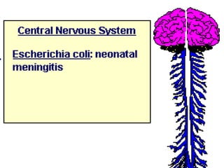 - Various pathogenic E. coli are described that can cause diseases like urinary tract infections, neonatal meningitis, and intestinal illnesses. Specific strains like ETEC, EIEC, EHEC, EPEC, and EAggEC are mentioned.