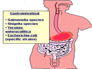- It describes various E. coli pathotypes (ETEC, EIEC, EHEC, EPEC, EAggEC) that can cause intestinal diseases like diarrhea. EHEC can also cause life-threatening hemolytic uremic syndrome.