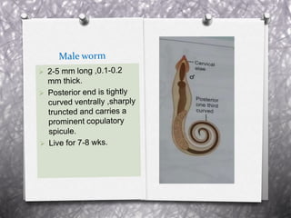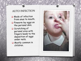 Pinworm, or Enterobius vermicularis, is a common parasitic worm that infects the human large intestine. The adult female worm lives in the caecum and colon and lays thousands of eggs per night around the anal area. The eggs are infectious within 6 hours of being laid and can remain viable for up to 2 weeks in moist conditions. People become infected by ingesting the eggs, often through hand-to-mouth contact. The life cycle is direct with no intermediate host. Pinworm infection is most common in children and can cause symptoms like anal itching and sleep disturbance.