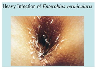 Enterobius vermicularis, also known as the pinworm or threadworm, is a parasitic nematode that infects the large intestine of humans. It has a worldwide distribution. The adult worms inhabit the cecum and ascending colon, where mating occurs. The female migrates to the perianal area at night to lay eggs, causing pruritus. Diagnosis is made by detecting eggs on perianal tape or swab samples under microscopy. Treatment involves a single dose of anthelmintic drugs like pyrantel pamoate or mebendazole. Personal hygiene measures and treating infected family members can aid prevention.