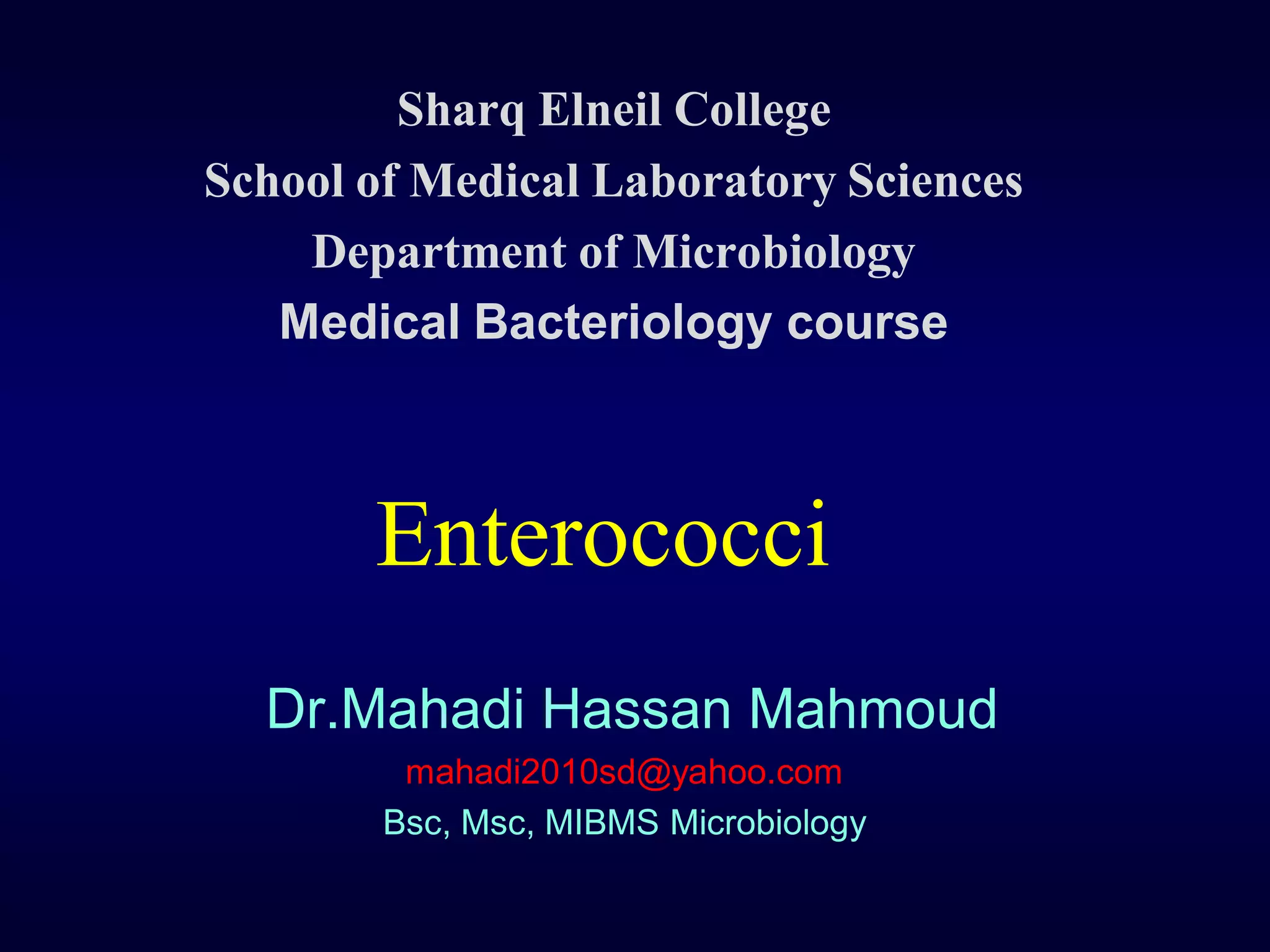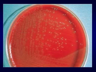 The document discusses Enterococci, including its natural habitats, morphology, general properties, medically important species, culture characteristics, virulence factors, pathogenicity, laboratory diagnosis, biochemical tests, Lancefield grouping, antibiotic resistance, and treatment options. Key points include that Enterococci normally inhabit the intestinal tract, oral cavity, and vaginal canal of humans and animals. The most common medically important species that cause nosocomial infections are Enterococcus faecalis and E. faecium. Laboratory identification involves culture, biochemical tests like catalase and sugar fermentation reactions, and determining Lancefield grouping. Antibiotic resistance is a concern, especially for vancomycin and penicillin.