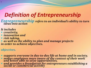 The document discusses the definition and importance of entrepreneurship and education, emphasizing the role of creativity, innovation, and risk-taking in fostering entrepreneurial mindsets. It highlights the need for entrepreneurship education across various school levels and the development of teachers' competence to inspire students. Additionally, it outlines strategic elements required for integrating entrepreneurship into the education system, including cooperation among stakeholders and resources for implementation.