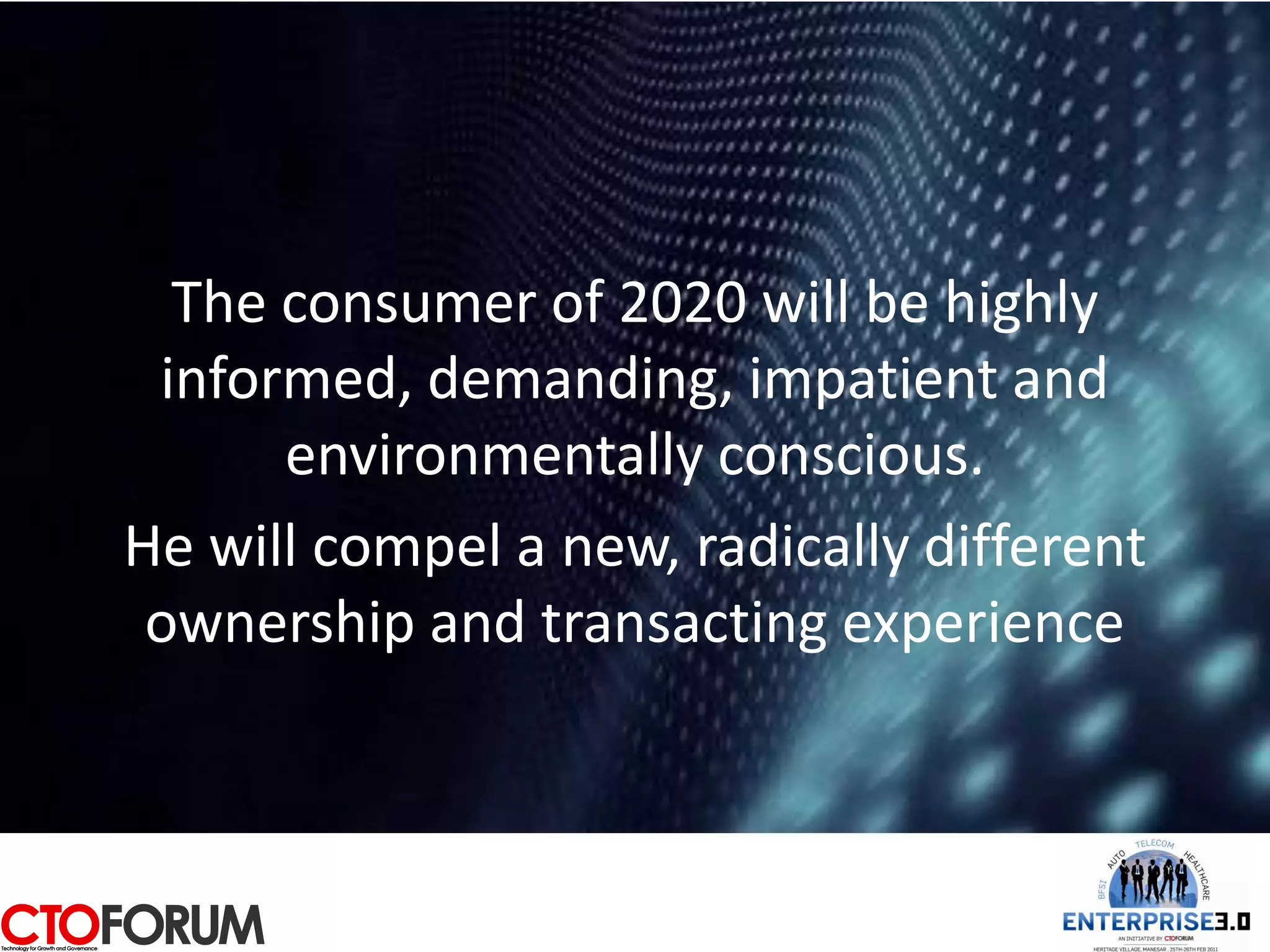 The document outlines the vision for the consumer experience in 2020, emphasizing informed and demanding consumers who will influence new ownership and transaction methods across various sectors, including automotive, healthcare, BFSI, and telecom. It highlights the importance of technological innovation and consumer-centric strategies in shaping the future of these industries while addressing the challenge of bridging the urban-rural divide in healthcare. The upcoming Enterprise 3.0 conference will focus on these themes, bringing together CIOs from leading companies to discuss sector-specific strategies and the evolving demands of consumers.