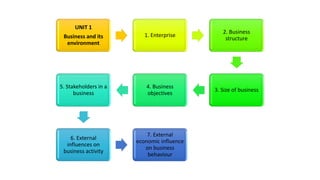 The document outlines the fundamentals of business and its environment, covering topics such as enterprise, business structures, objectives, and the role of entrepreneurs. It emphasizes the importance of adding value, common types of entrepreneurial businesses, and challenges faced by entrepreneurs, including failures and their impacts on the economy. Additionally, it discusses social enterprises and their objectives, focusing on the triple bottom line of economic, social, and environmental goals.