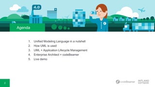 The document discusses the integration of Unified Modeling Language (UML) with application lifecycle management (ALM) using Intland Software's Codebeamer. It highlights UML as a crucial tool for visualizing system architecture and emphasizes the seamless synchronization and traceability of requirements through the use of enterprise architect tools. A live demonstration and Q&A session followed the presentation, aimed at showcasing the practical application of these concepts.