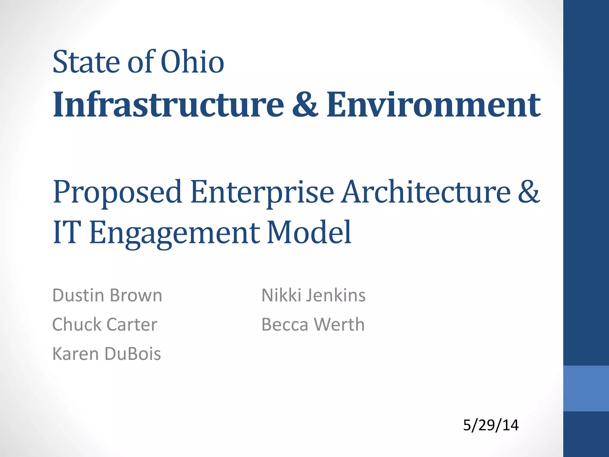 The document proposes an enterprise architecture and IT engagement model for Ohio's infrastructure and environment agencies. It summarizes the current decentralized IT environment, lack of standards, and security risks. The proposed model shifts to a coordinated operating model with shared solutions and standardized technology. Key elements include a technology board to prioritize projects, an architecture team to define standards, and a project success center to ensure project delivery and benefits realization. The goals are improved efficiency, cost savings, security, and reduced duplication through greater coordination and data sharing across agencies.