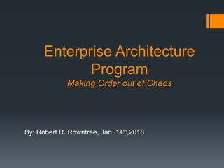 This document discusses enterprise architecture and provides strategies for its effective implementation. It begins by defining enterprise architecture and explaining its importance in linking technology investments to business goals and ensuring systems interoperate. It then discusses balancing architecture quality with project constraints and having an approach that provides superior customer service and measurable results. Finally, it covers developing a technology strategy that is aligned with and drives the business vision and goals.