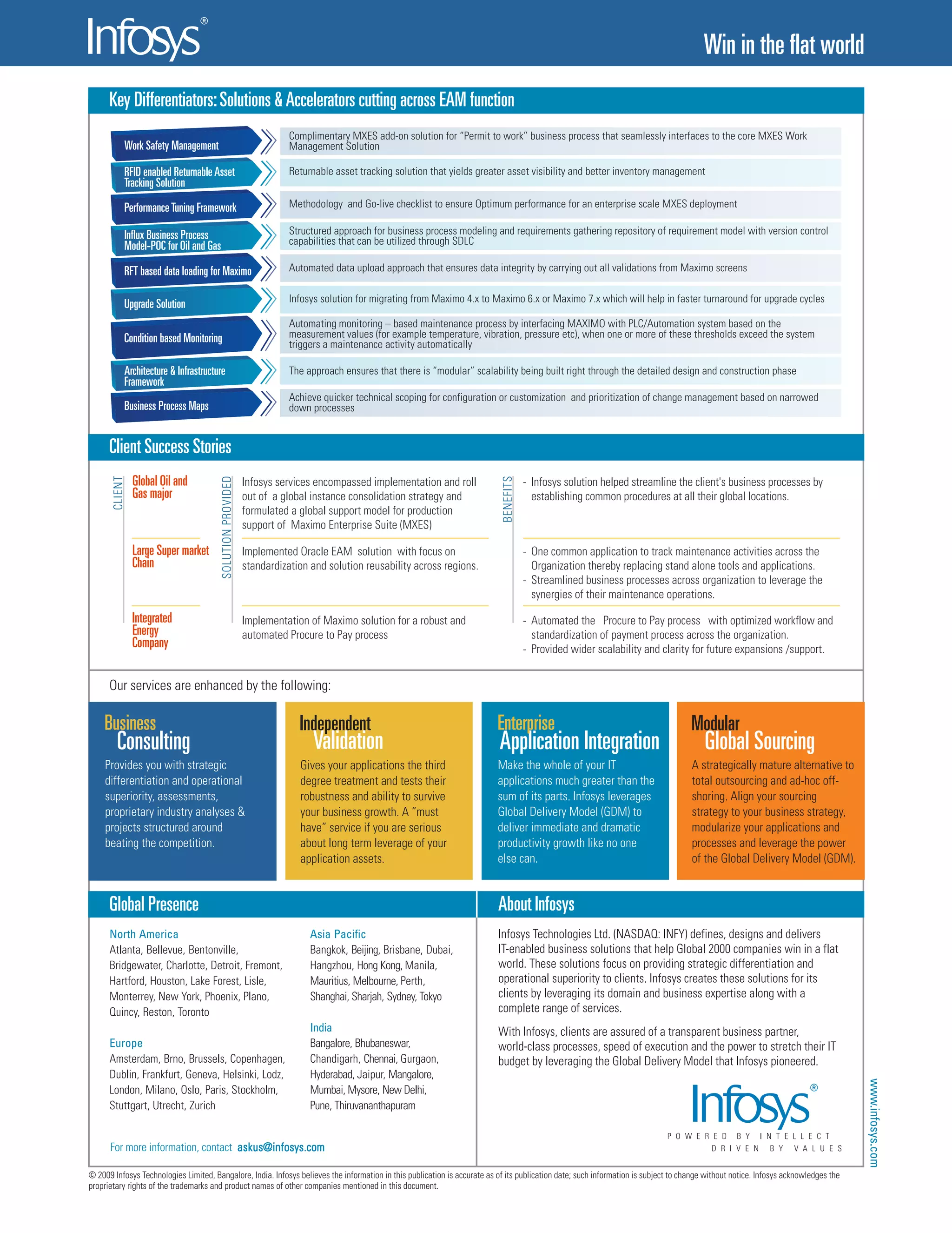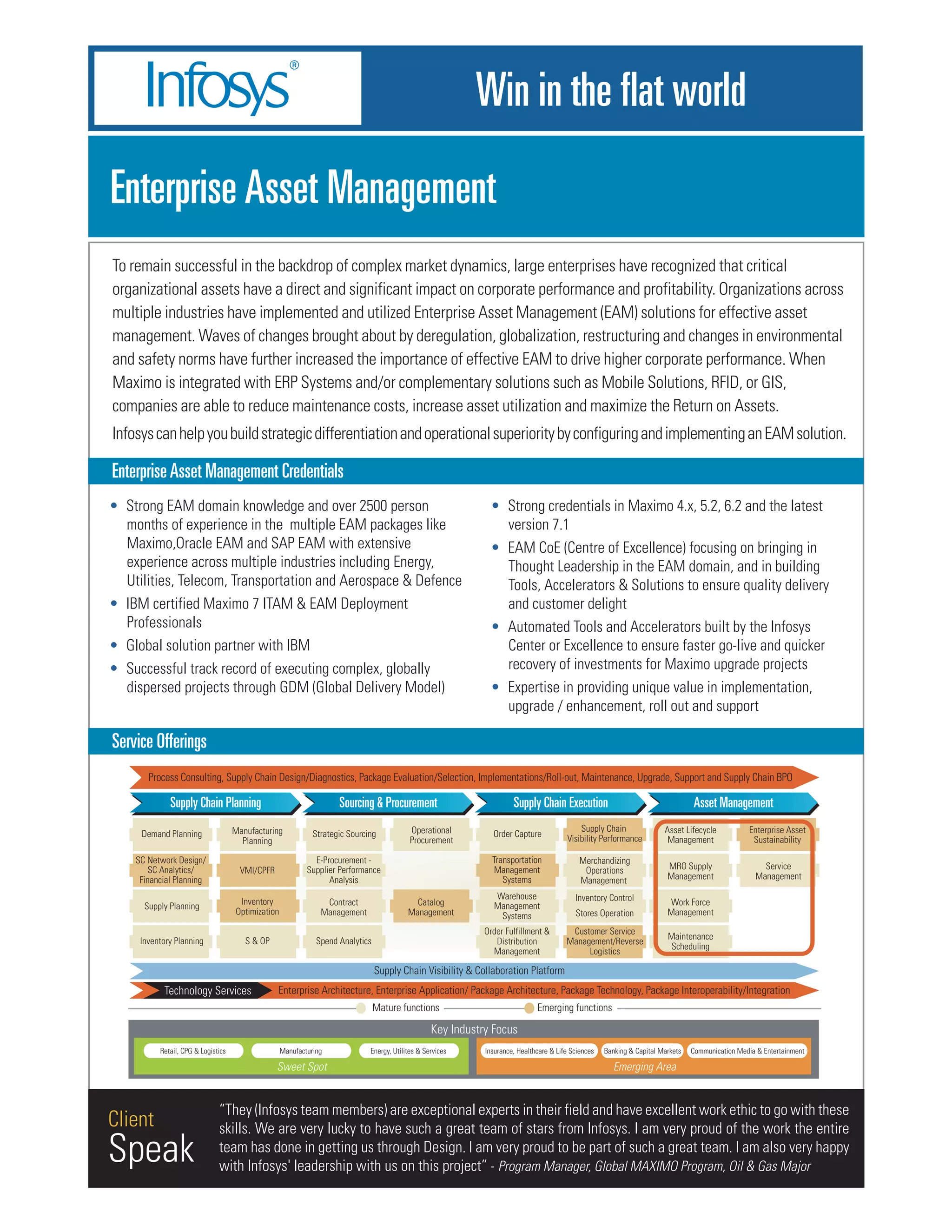 Enterprise Asset Management (EAM) solutions help large enterprises effectively manage critical organizational assets to improve corporate performance. Changes in the business environment have increased the importance of EAM. Integrating EAM with other systems like ERP allows companies to reduce costs, increase asset usage, and maximize returns. Infosys can help companies implement and customize EAM solutions to gain strategic and operational benefits.