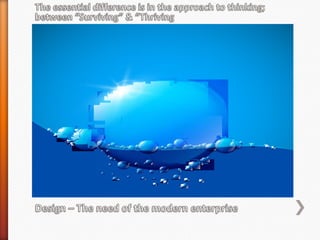 The document discusses key aspects of managing a modern enterprise. It states that an enterprise should be defined as an ecosystem of value where information can flow freely. Customer aspirations, not a business's own aspirations, are most important. Processes should enable differentiation, not just repetition, and should impact customers towards growth. Managing an enterprise requires balancing outcomes and results to bridge potential and performance. Leadership must unify around a common frame of reference for successful global implementation.