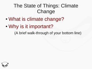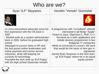 The document introduces Iliyan Stoyanov and Venelin Gornishki, highlighting their professional backgrounds in programming and IT. It discusses the impact of climate change, the political aspects surrounding it, and the significance of cloud computing on energy consumption, emphasizing the growth in public cloud energy usage. Additionally, it provides insights into building private clouds using open-source tools like KVM and LXC, along with strategies for virtualization and transitioning to public cloud environments.