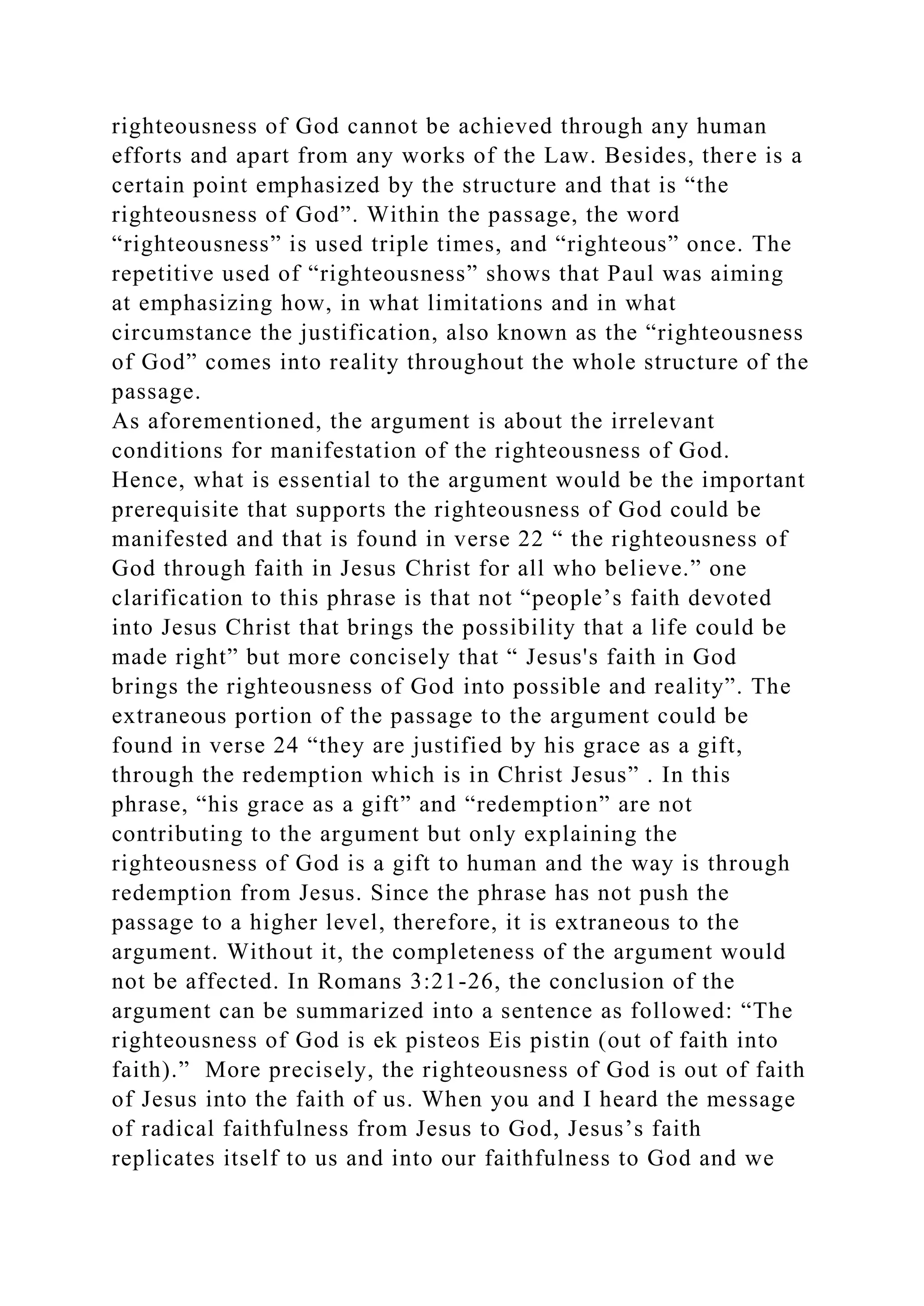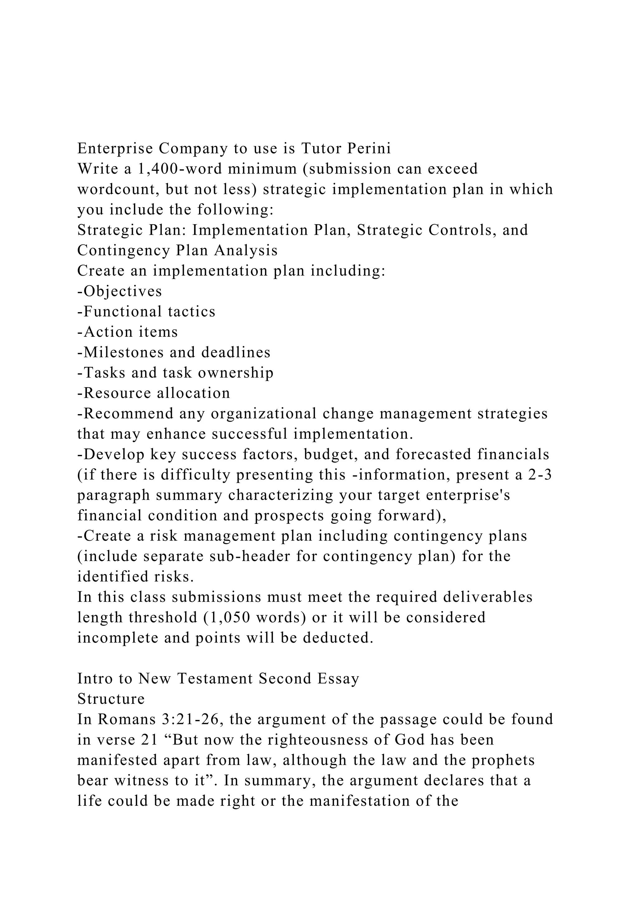 The document outlines the requirements for a strategic implementation plan for Tutor Perini, including objectives, functional tactics, action items, and a risk management plan with contingency strategies. It also discusses the theological interpretation of Romans 3:21-26, emphasizing the concept of righteousness as attainable through faith in Jesus rather than human efforts or adherence to the law. The text contrasts the tones and content of associated biblical passages, illustrating the evolution of the message of salvation and righteousness in the context of early Christian teachings.