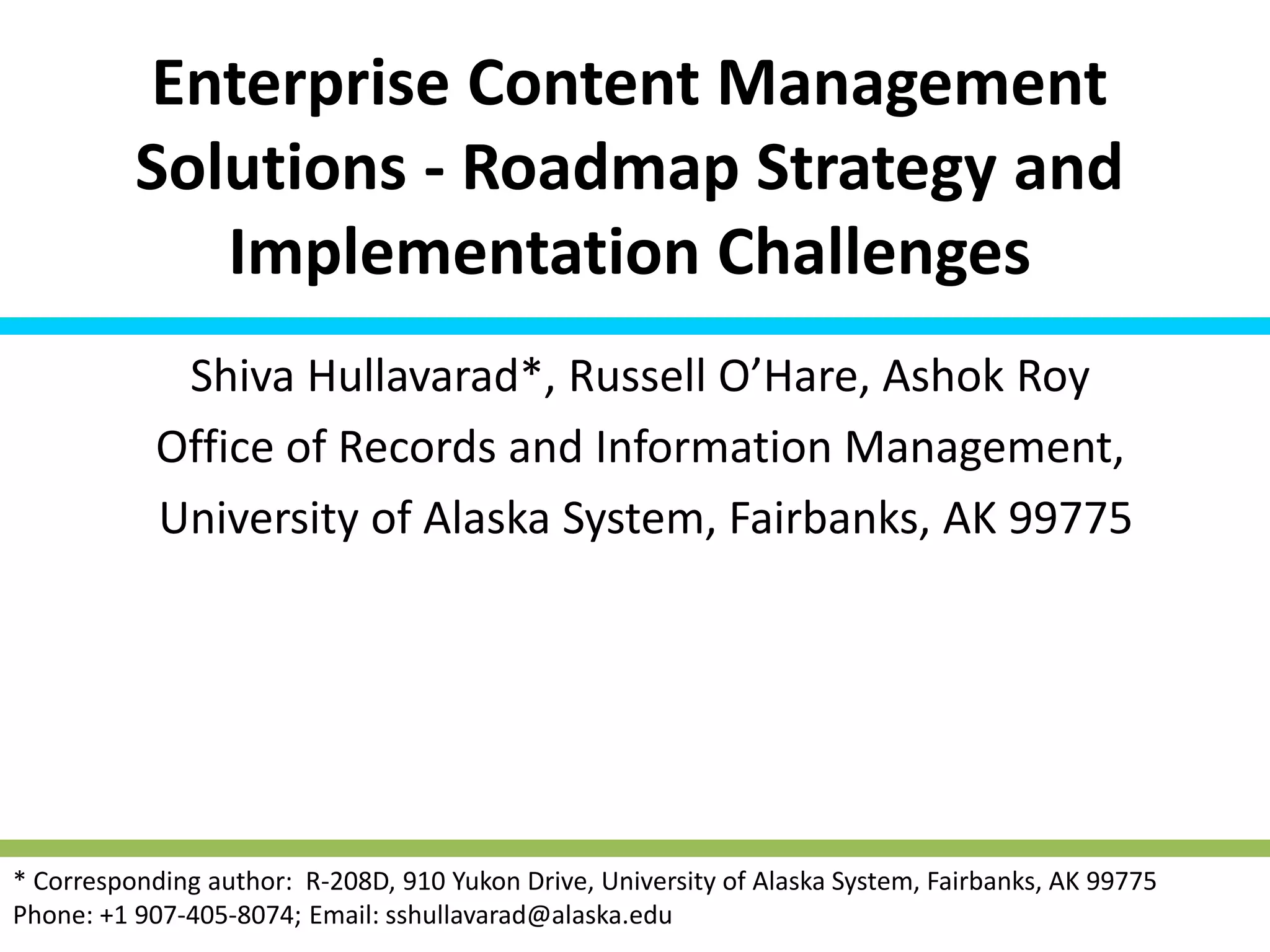 The document discusses enterprise content management (ECM) solutions and their implementation challenges at the University of Alaska System. It outlines the significance of ECM in managing information assets throughout their lifecycle, highlighting its architecture and the stages of implementation essential for improving organizational efficiency. Key conclusions emphasize the need for understanding data streams, robust functionality of ECM solutions, and a structured approach to minimize implementation delays.