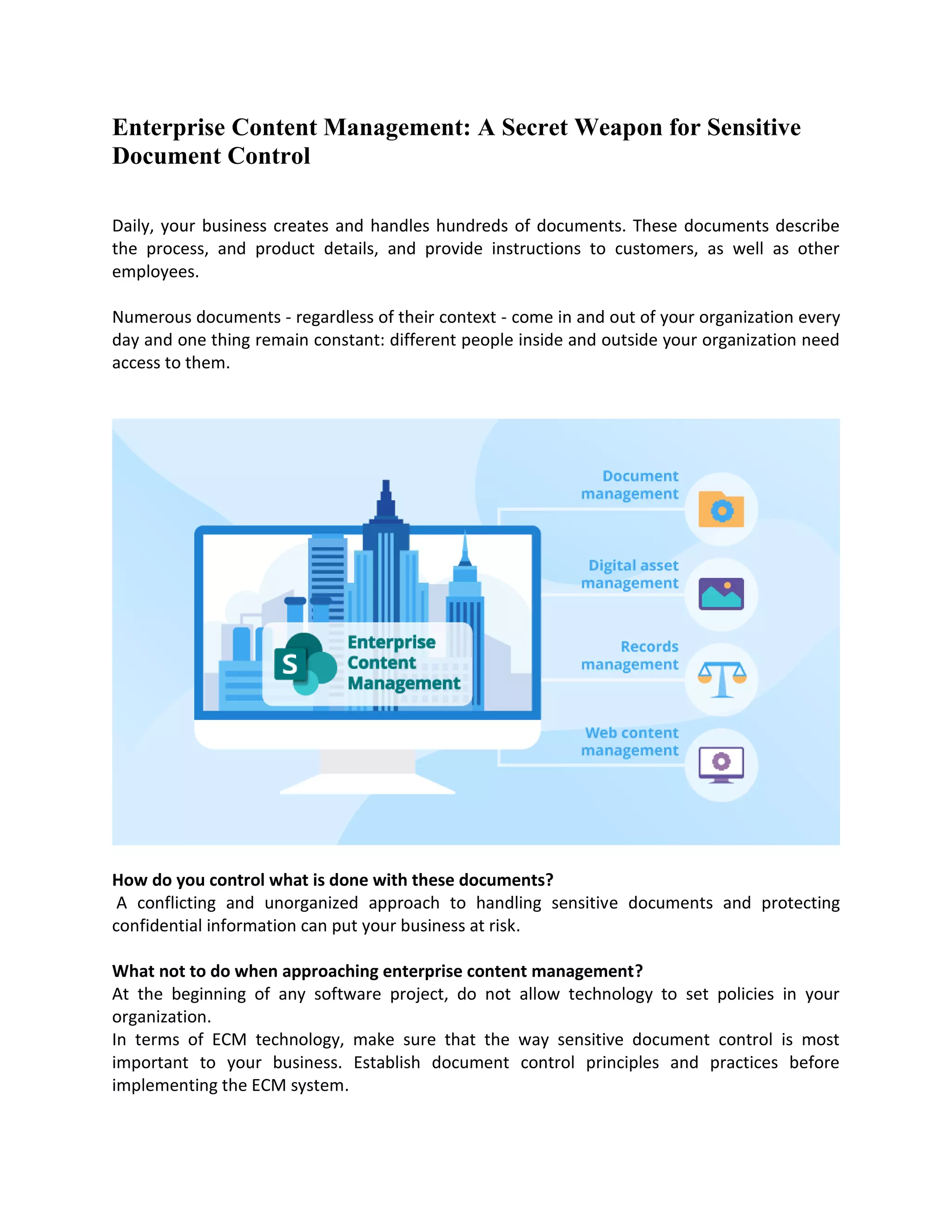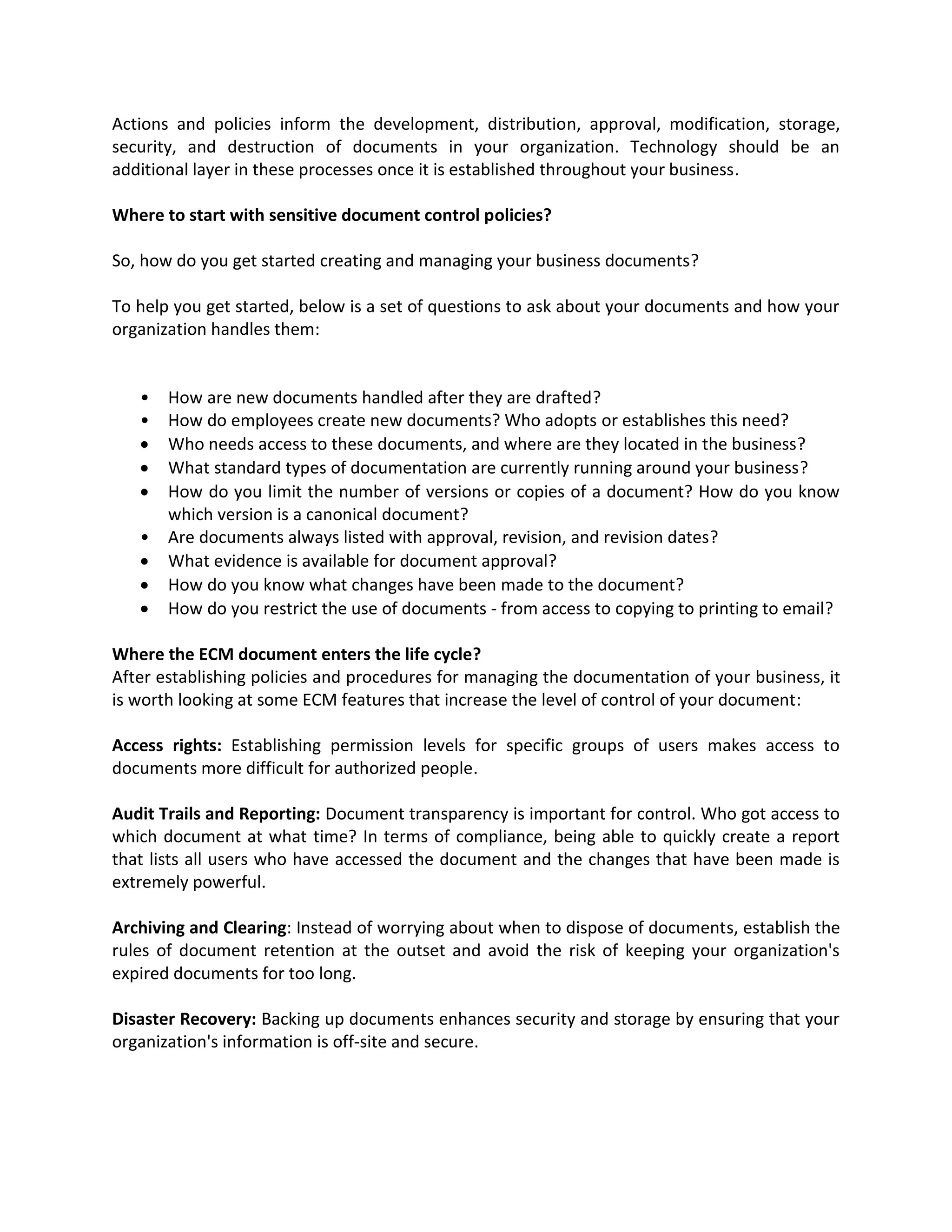 Enterprise content management (ECM) is essential for controlling access to sensitive documents within an organization and requires establishing clear policies before implementation. Key considerations include defining document handling procedures, such as access rights and audit trails, to ensure compliance and security. Proper document control not only mitigates risks but also enhances overall business processes and profitability.